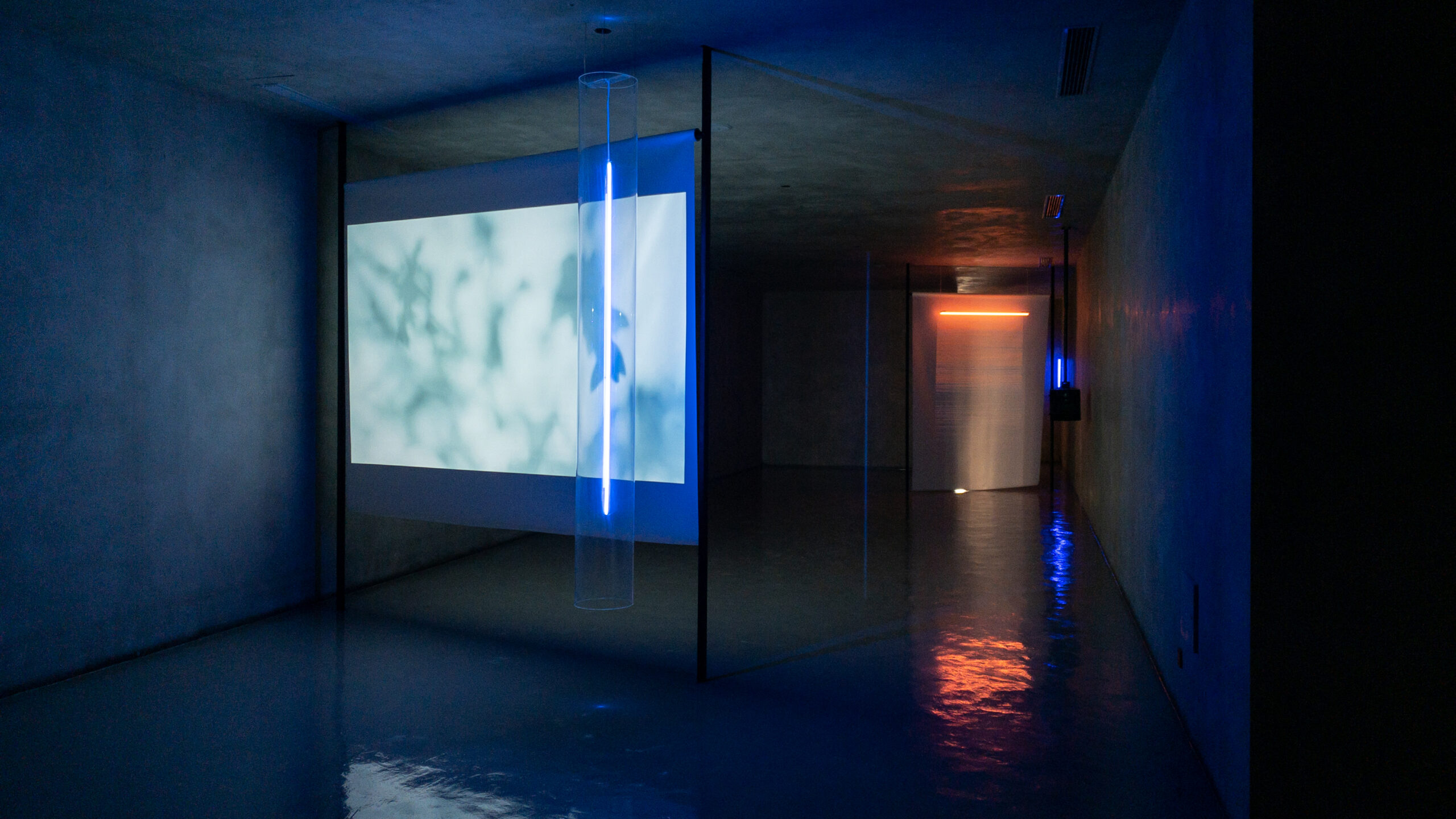uranographiaの作品《鳥鳴澗》は、実際に水を使用したインスタレーションです。幕の奥からあふれる柔らかな光が、水盤に張られた水に反射して煌めきます。また、青いネオン管の光で花の色が消えたように見える仕掛けなど、フィジカルな物質と光の関係をさぐる試みが展開されました。