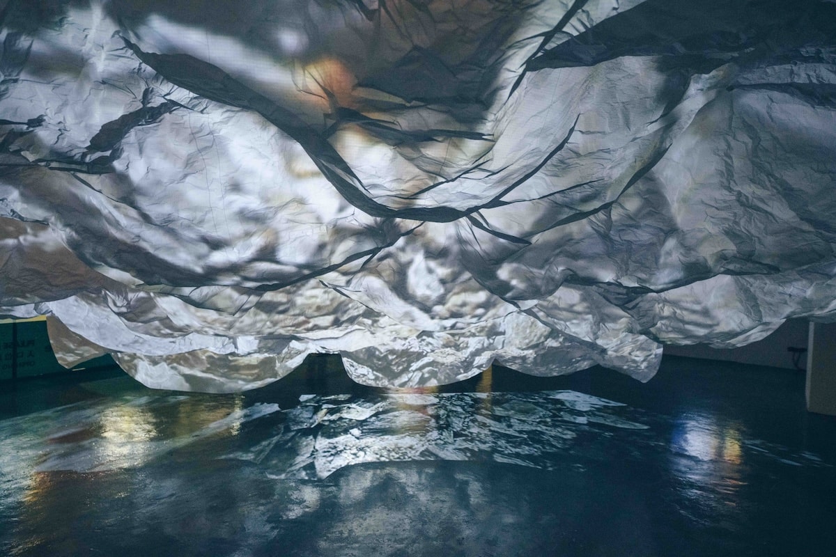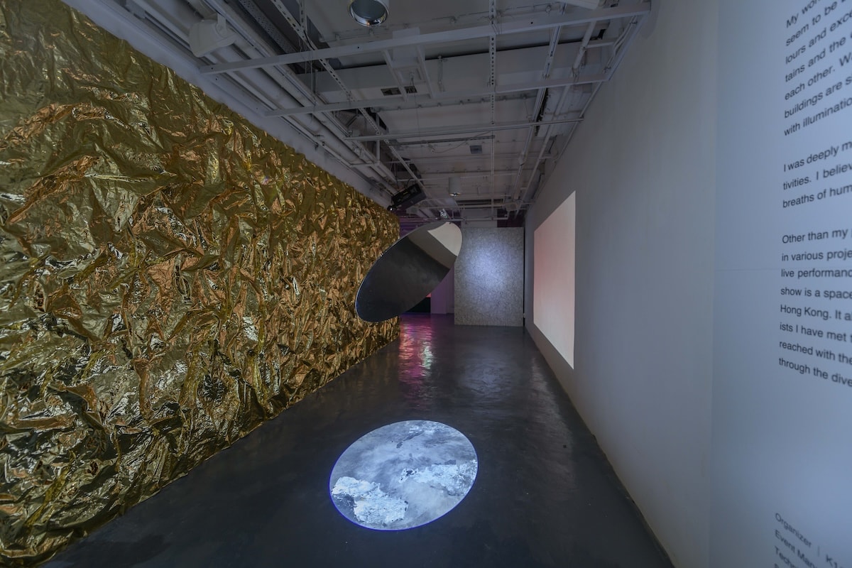 K11を訪れる多様な客層が楽しめる、「インタラクティブかつカラフルな展示を」とのクライアントからの要望を踏まえ、展覧会では、リサーチの中で津田が手に取ったさまざまな建築資材——金色に反射するシート、多様な色の水糸など——を用いた作品群や、宙に浮かぶ紙の構造物に香港の風景を投影するインスタレーションを展開しました。コダマシーンは、アーティスト/クライアント/加工業者の間の橋渡しとなり、展示の企画から実現まで包括的にアシストしました。