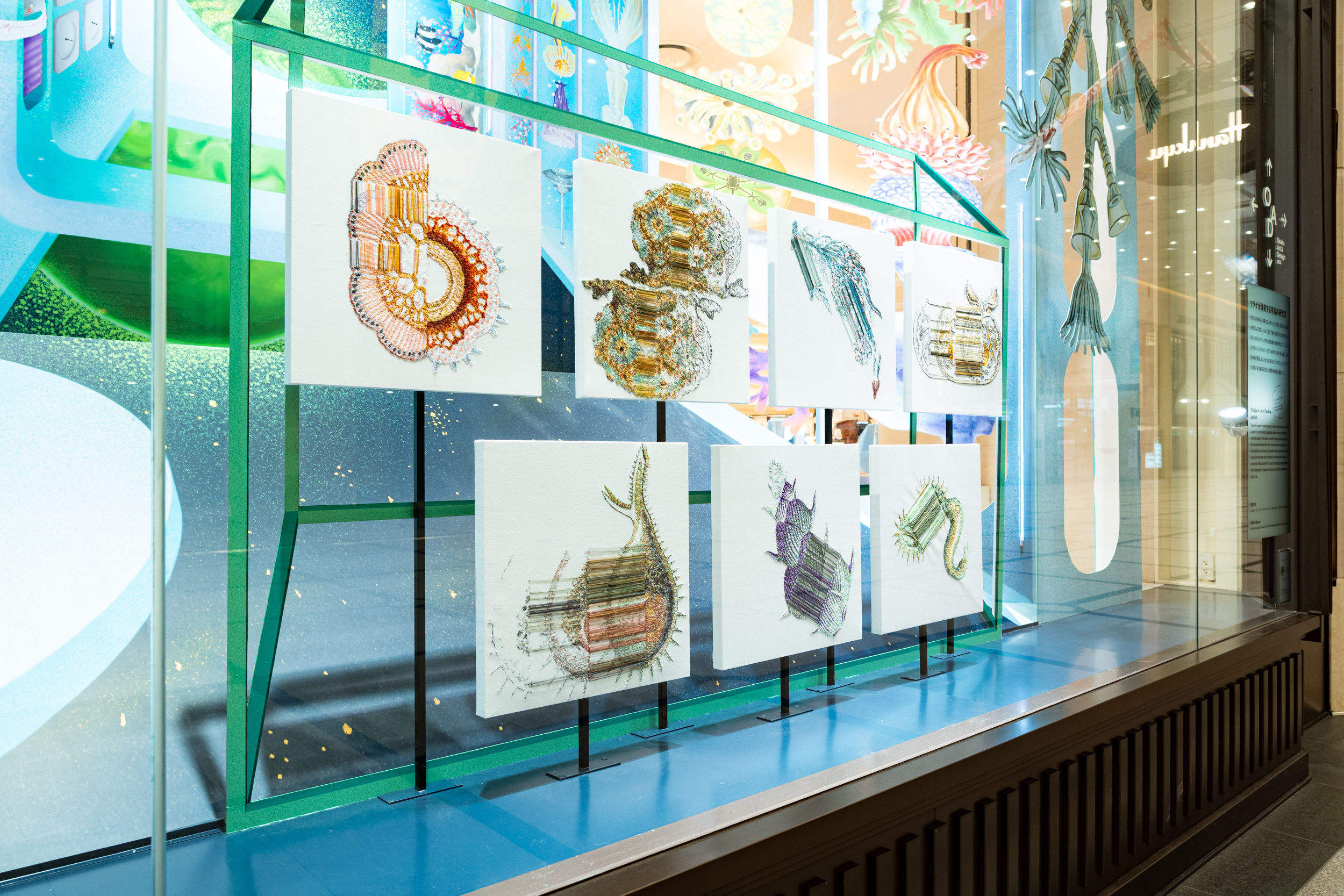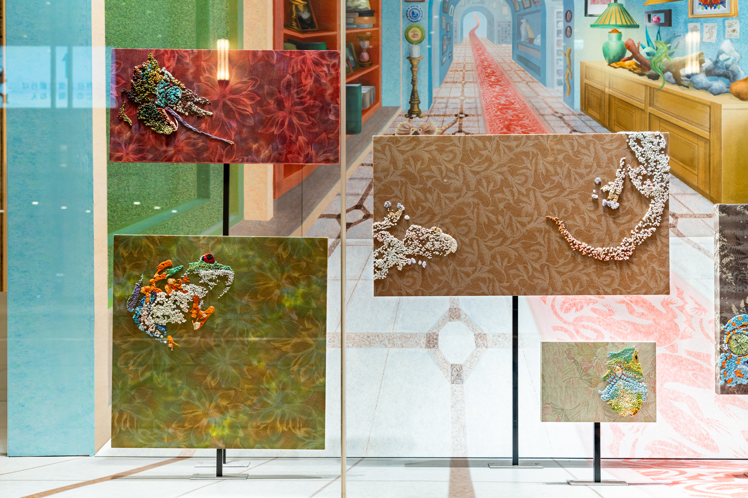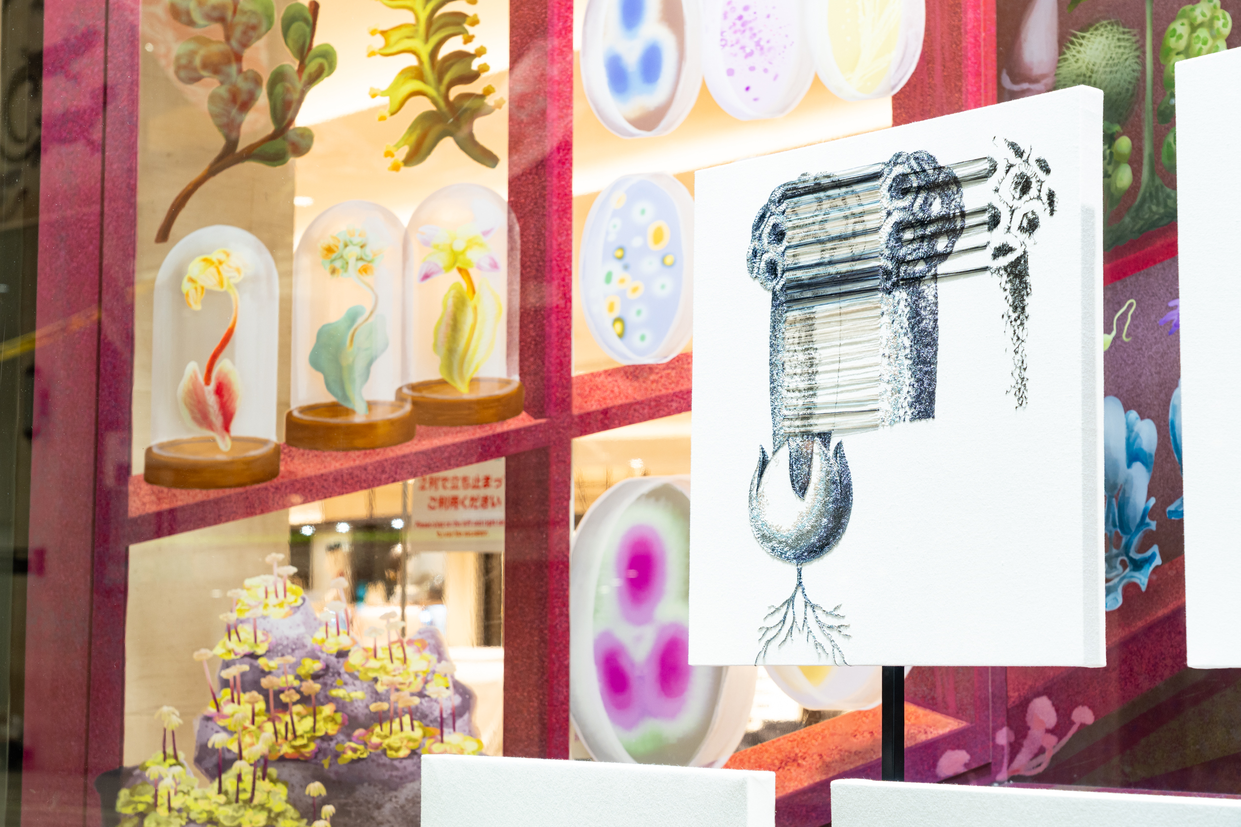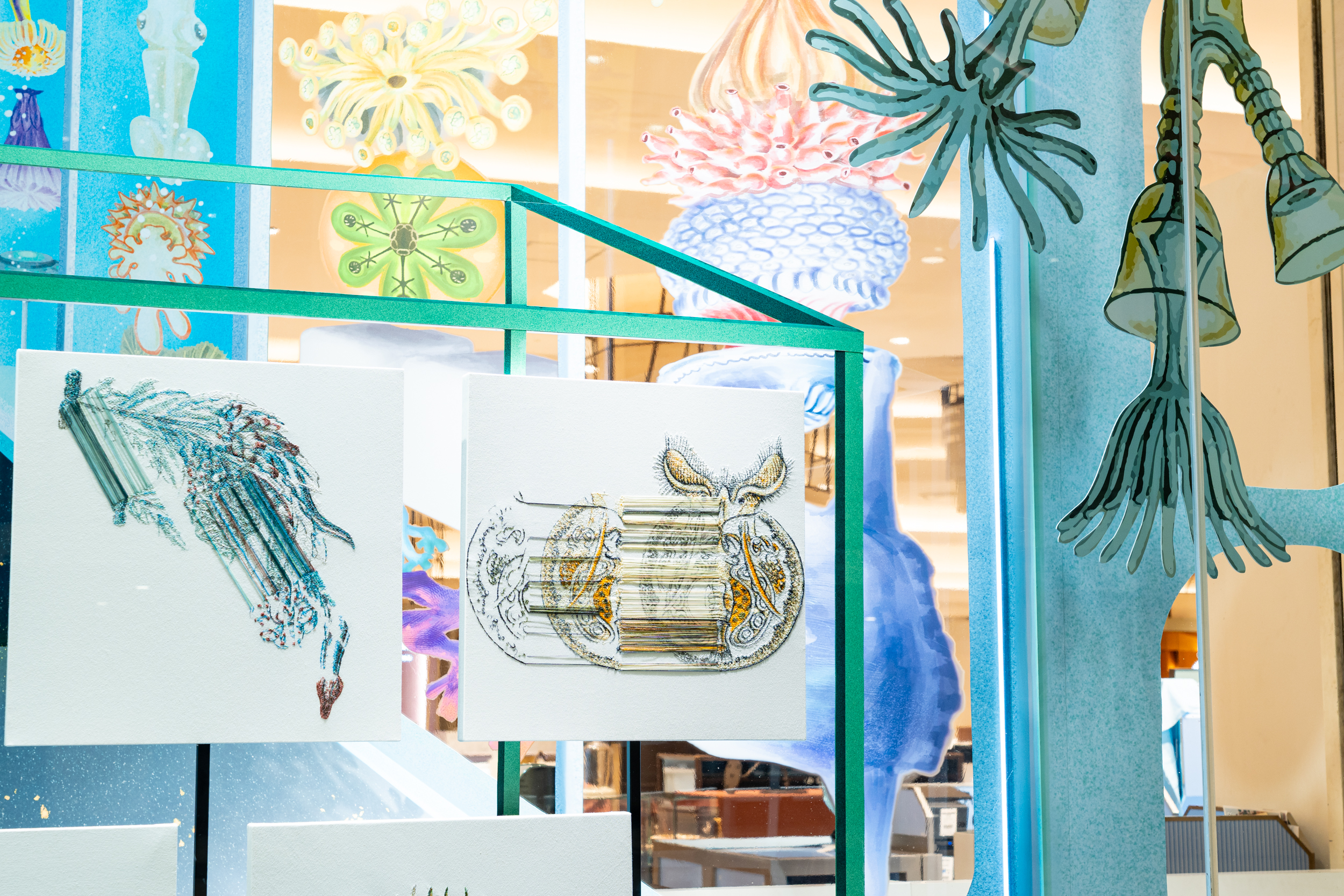 《ニュー博物誌~好奇心の遺伝子~》では、百貨店のウィンドウがさまざまな動植物の息づく空間に変化し、巨大な博物図鑑がコンコースに浮かび上がります。宮田彩加が手がけた刺繍作品には、ドイツの生物学者エルンスト・ヘッケルの生物画や、古今東西の布に描かれた動植物が引用され、ミシンの誤作動を巧みに利用した偶発的な形状が、自然界に潜む、思いもよらない展開の可能性をほのめかしています。