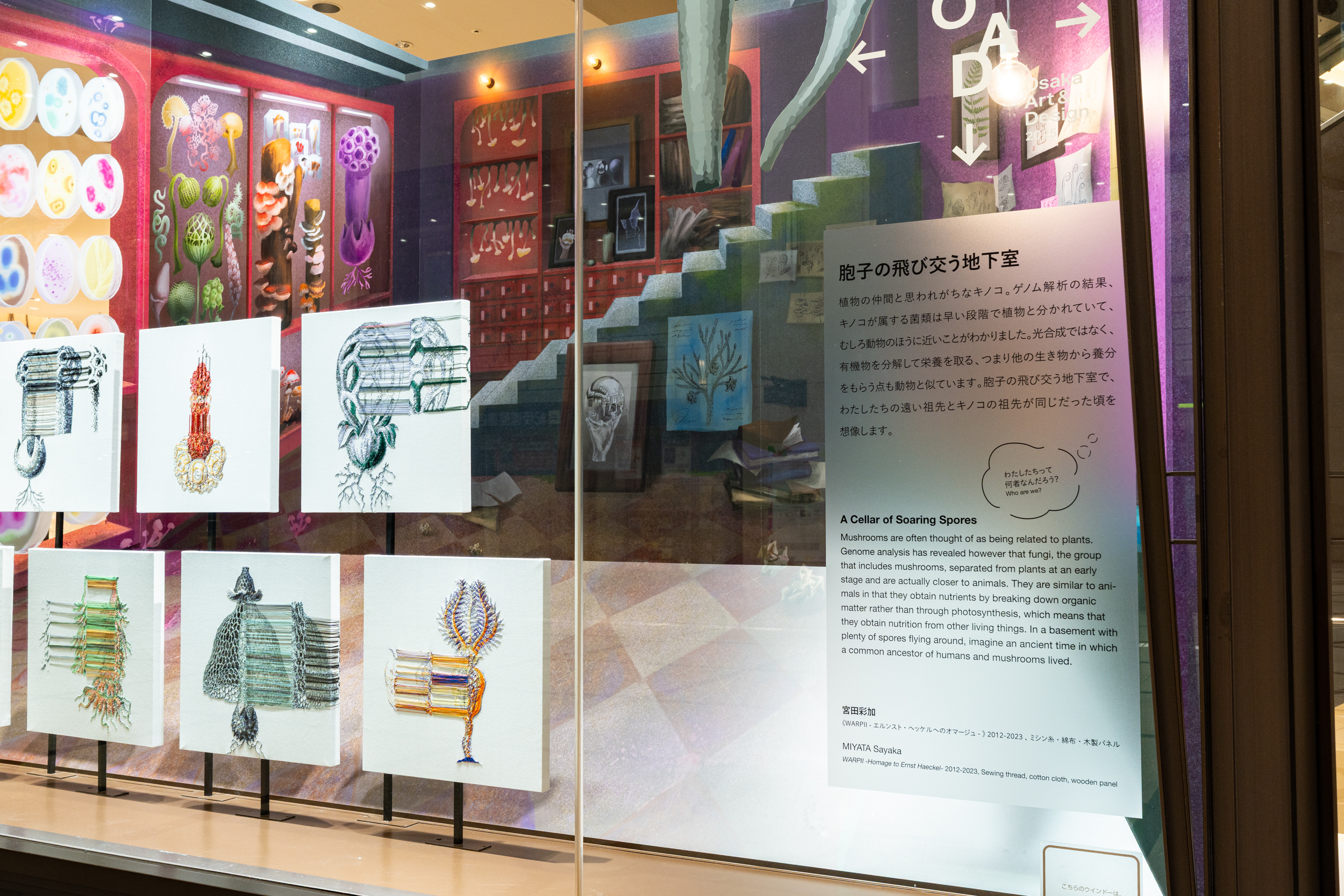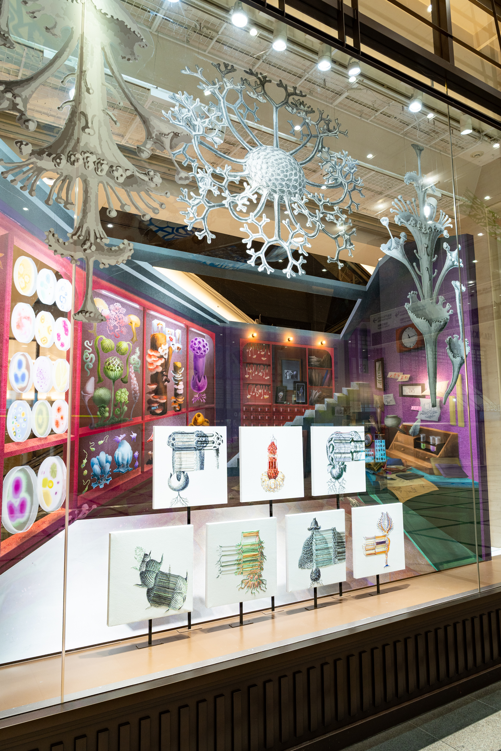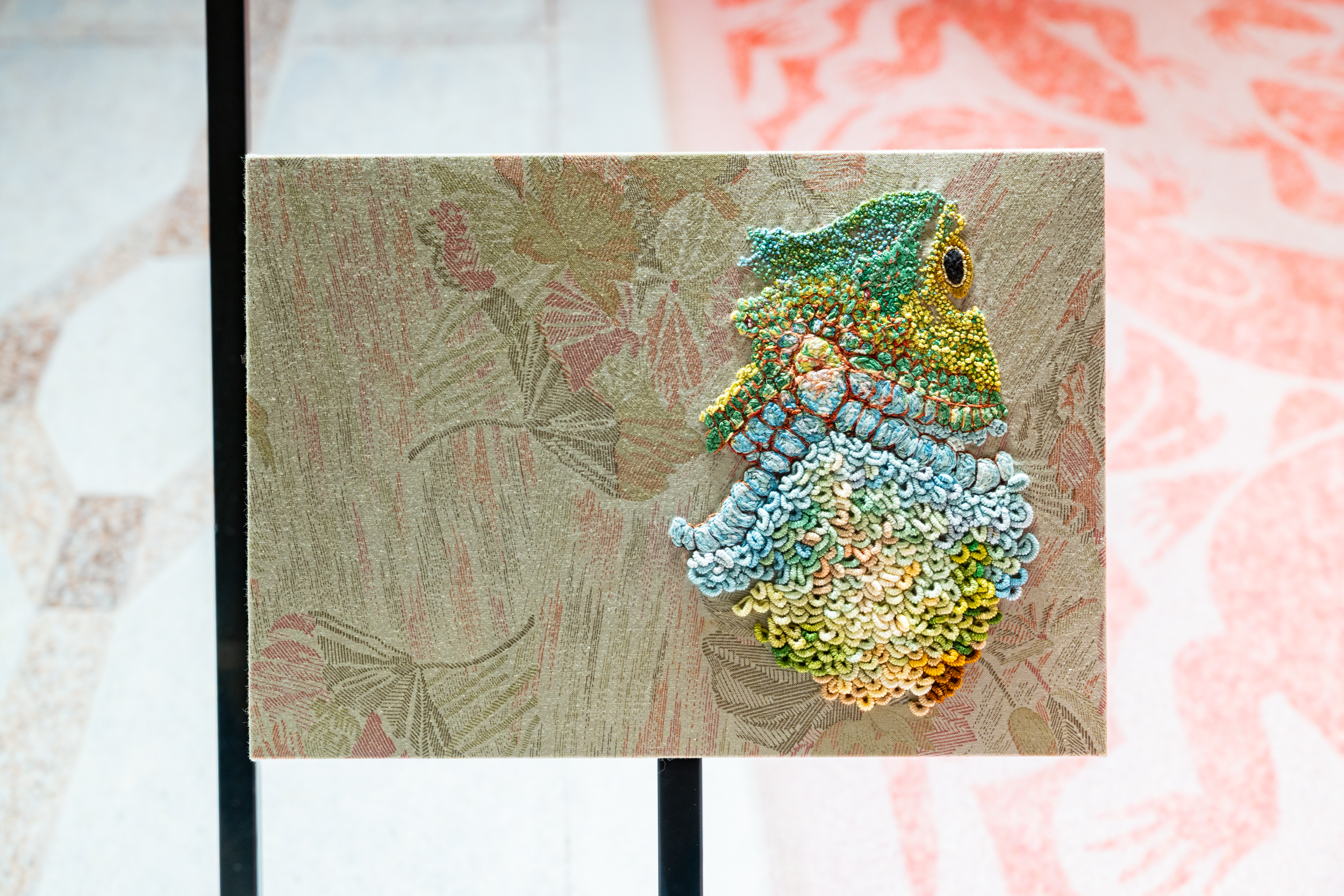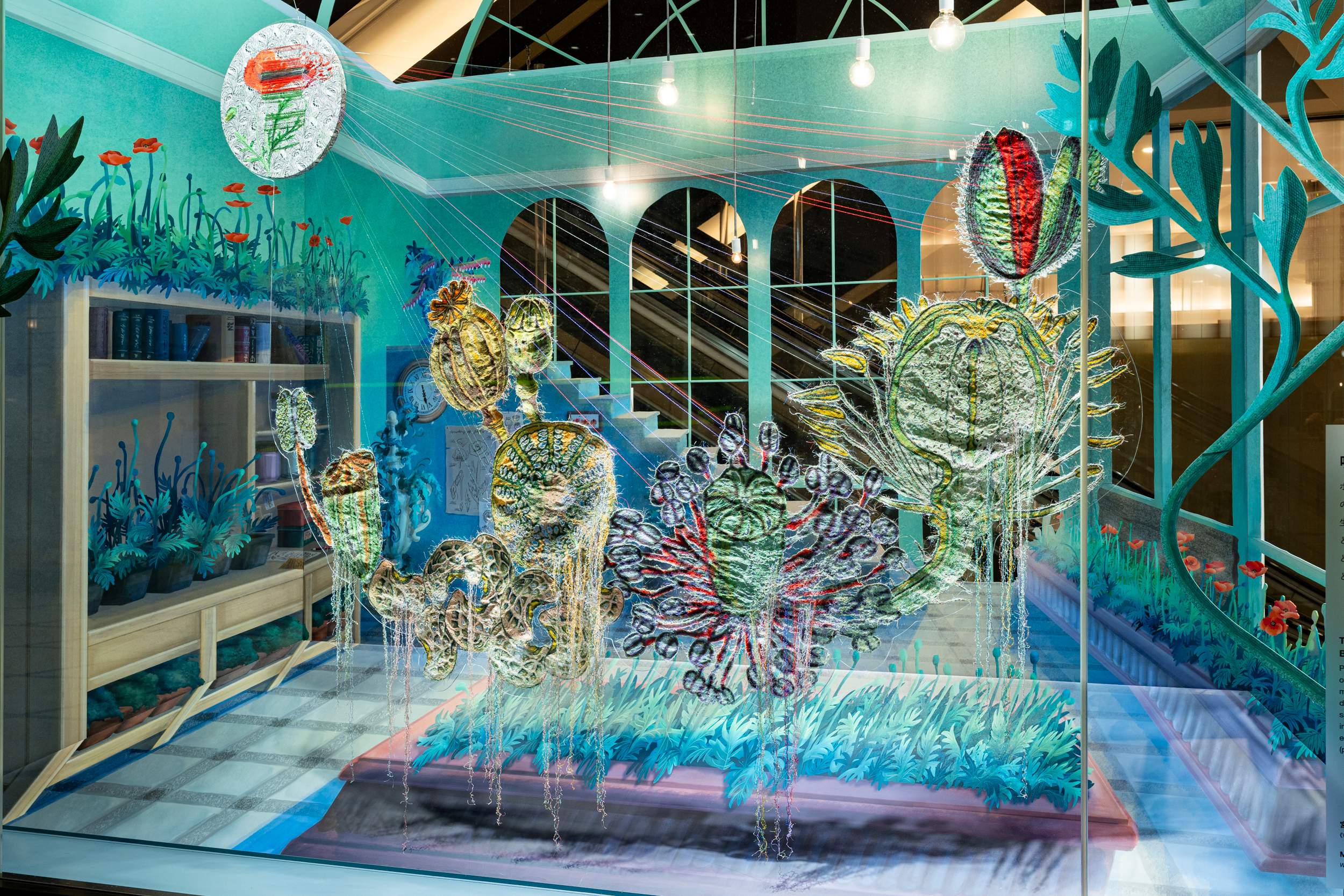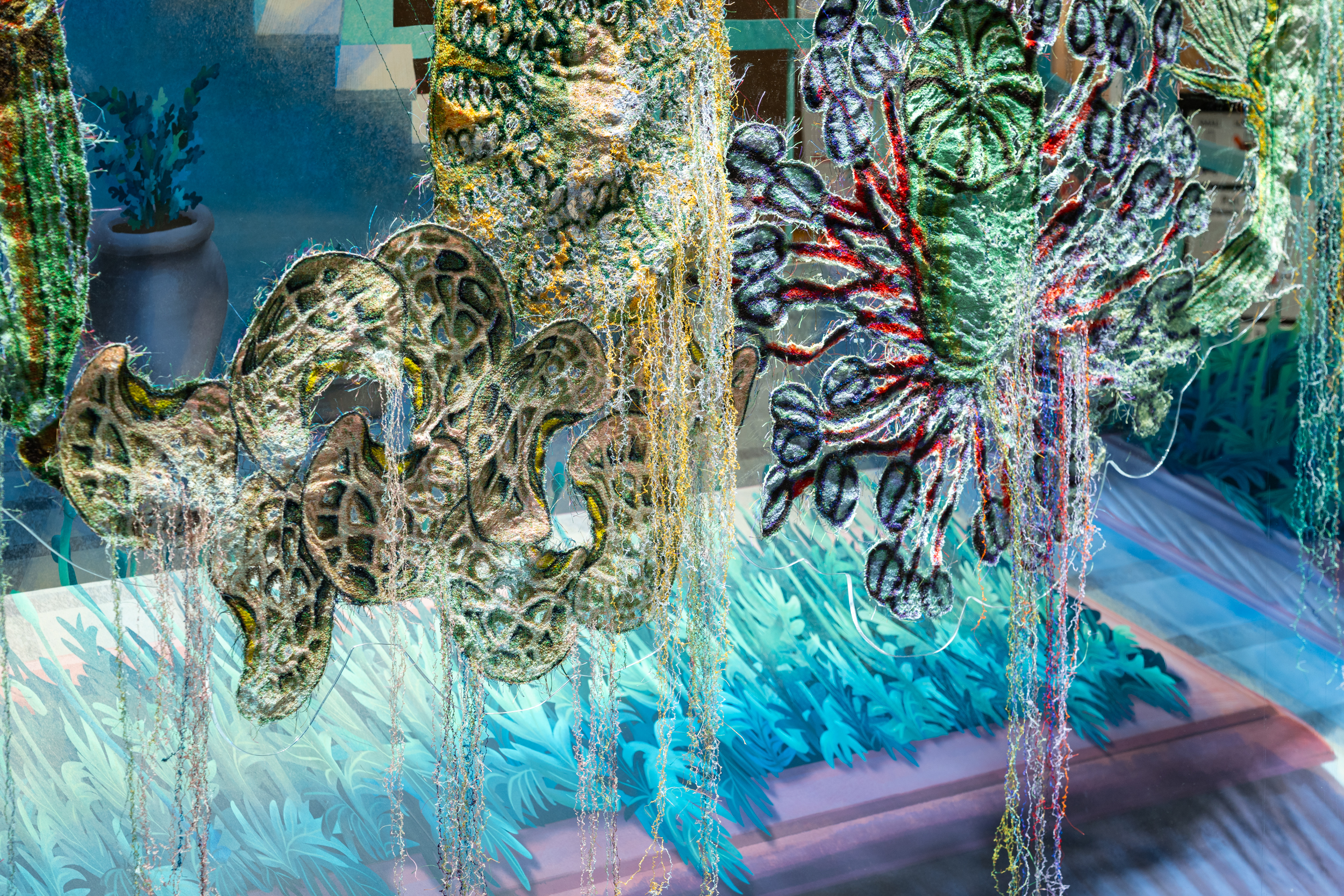 《ニュー博物誌~好奇心の遺伝子~》では、百貨店のウィンドウがさまざまな動植物の息づく空間に変化し、巨大な博物図鑑がコンコースに浮かび上がります。宮田彩加が手がけた刺繍作品には、ドイツの生物学者エルンスト・ヘッケルの生物画や、古今東西の布に描かれた動植物が引用され、ミシンの誤作動を巧みに利用した偶発的な形状が、自然界に潜む、思いもよらない展開の可能性をほのめかしています。