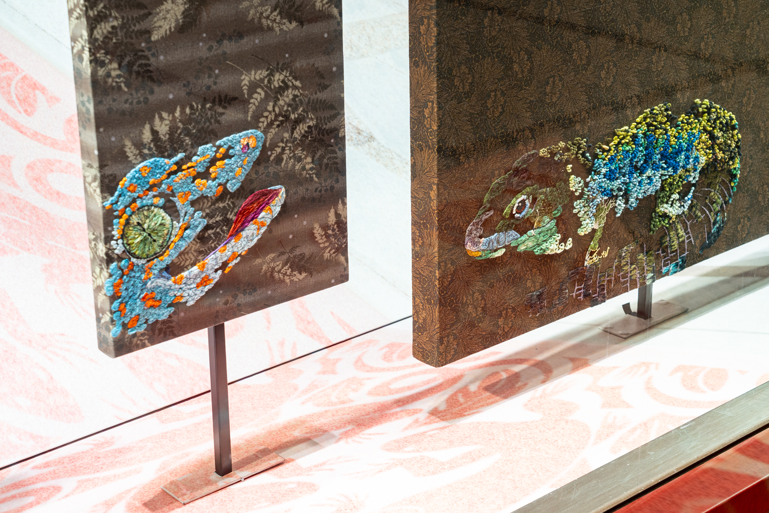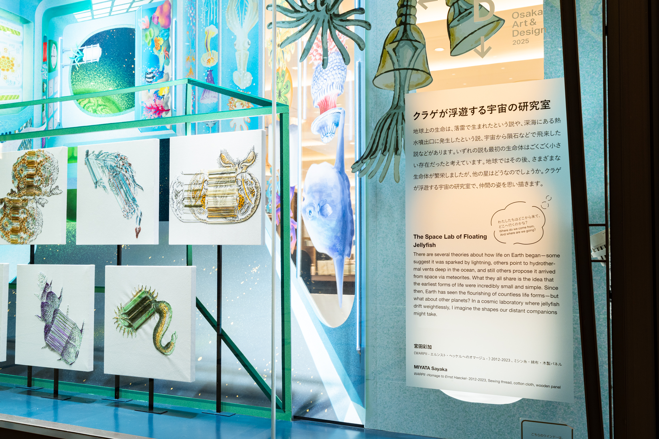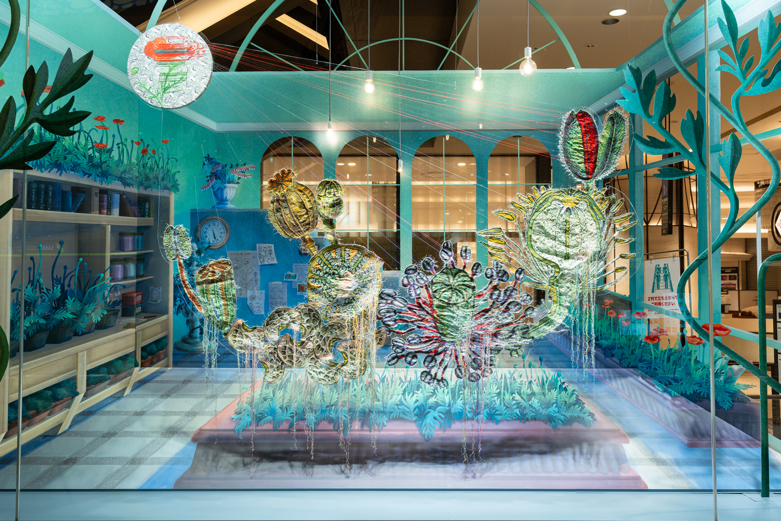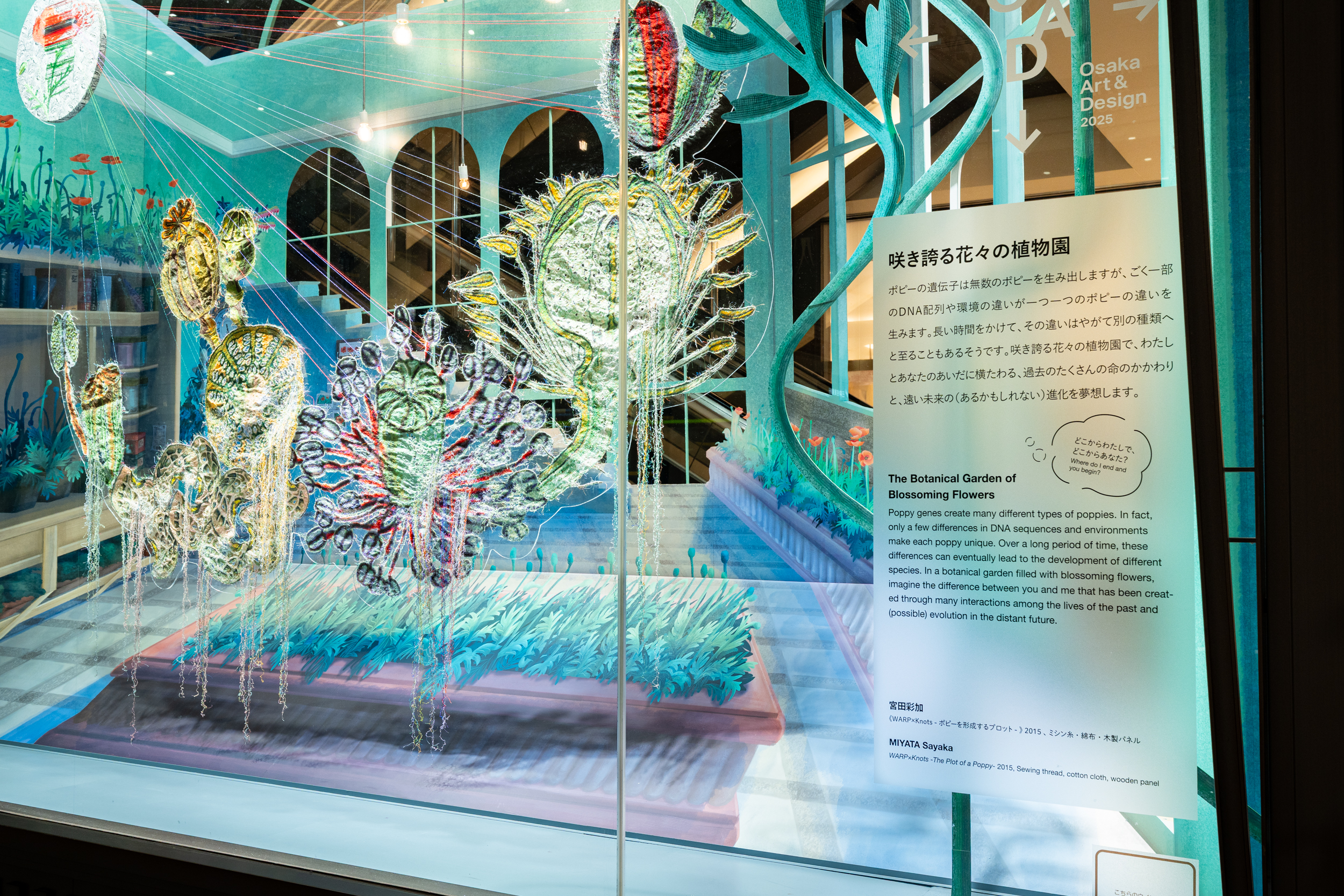 《ニュー博物誌~好奇心の遺伝子~》では、百貨店のウィンドウがさまざまな動植物の息づく空間に変化し、巨大な博物図鑑がコンコースに浮かび上がります。宮田彩加が手がけた刺繍作品には、ドイツの生物学者エルンスト・ヘッケルの生物画や、古今東西の布に描かれた動植物が引用され、ミシンの誤作動を巧みに利用した偶発的な形状が、自然界に潜む、思いもよらない展開の可能性をほのめかしています。