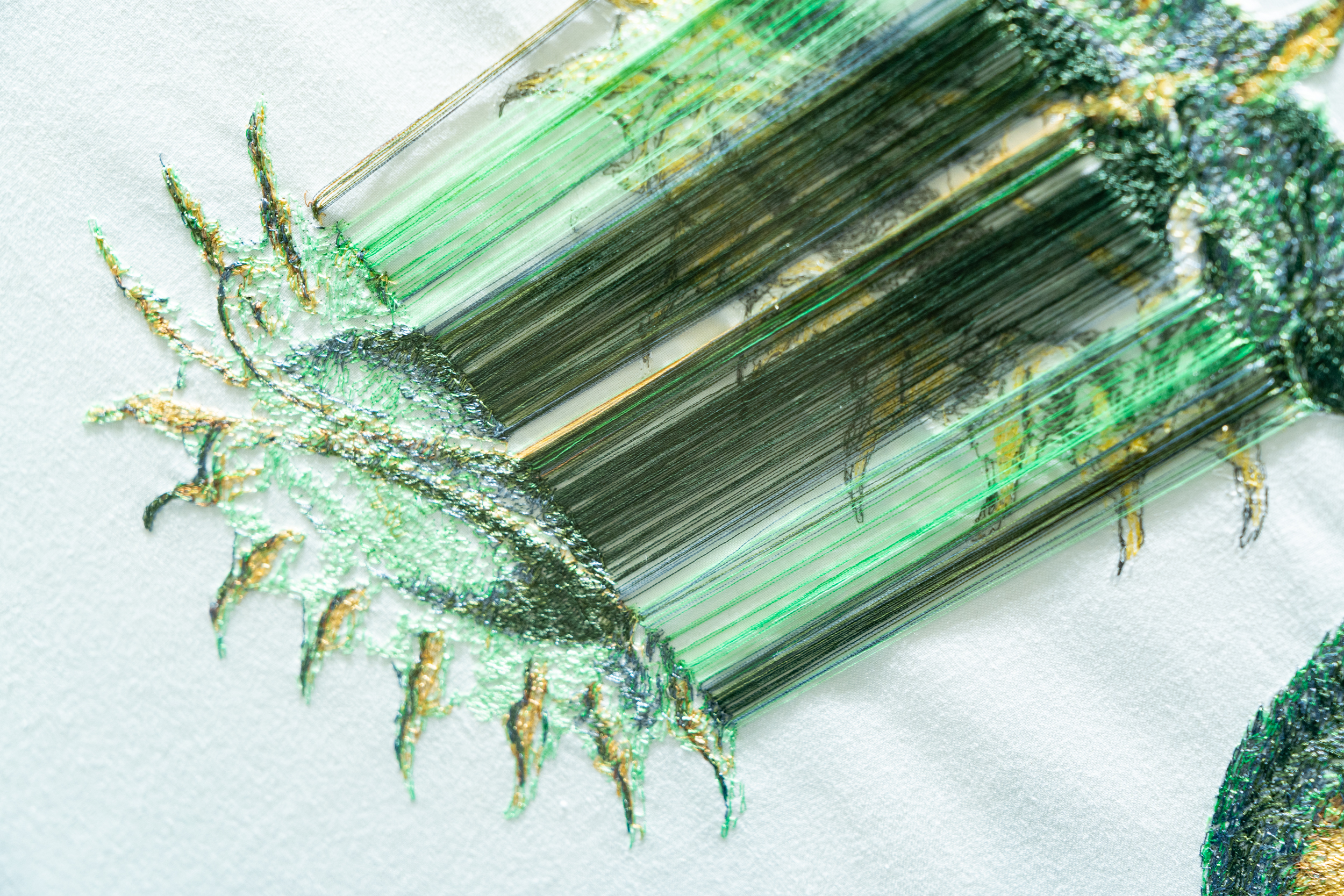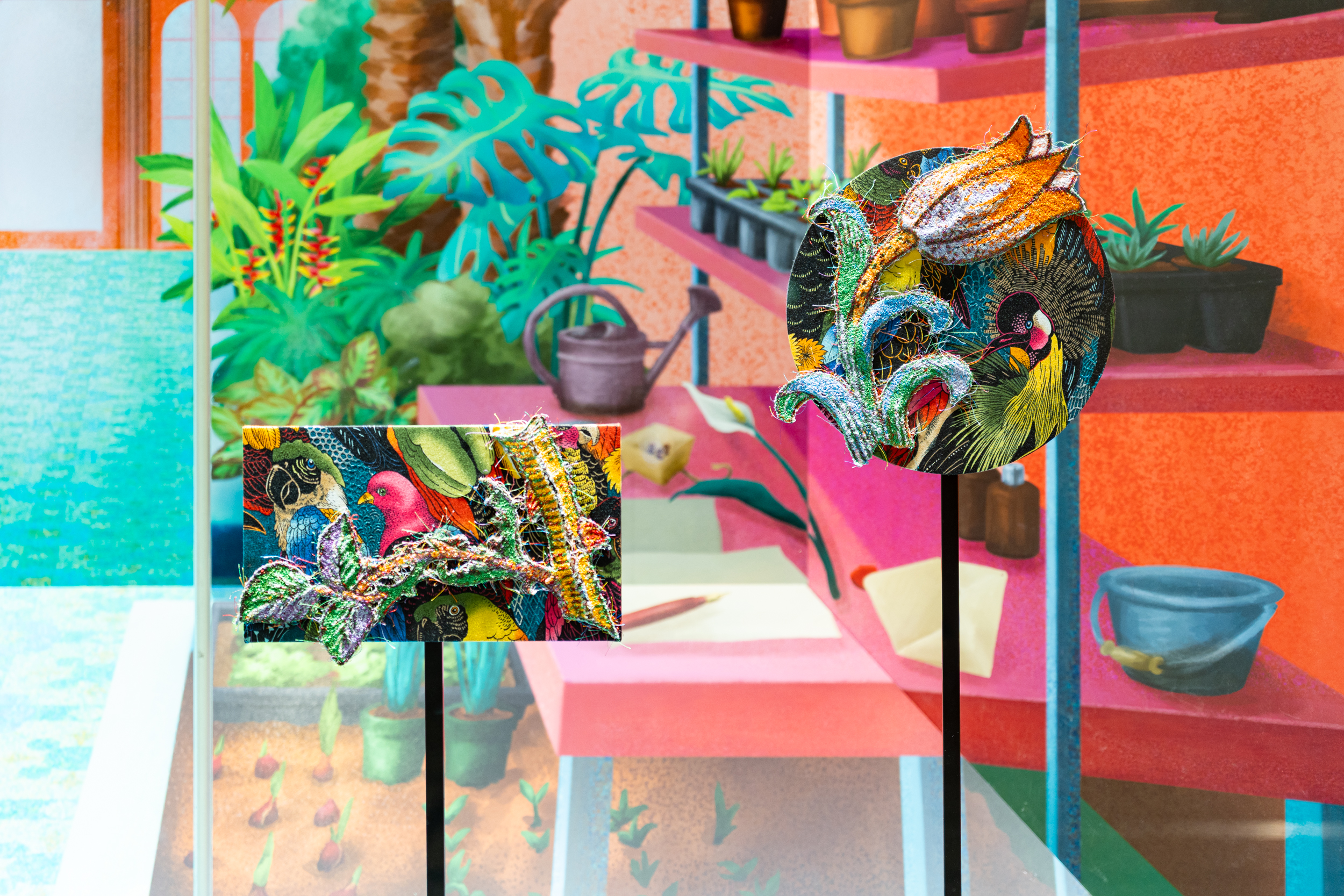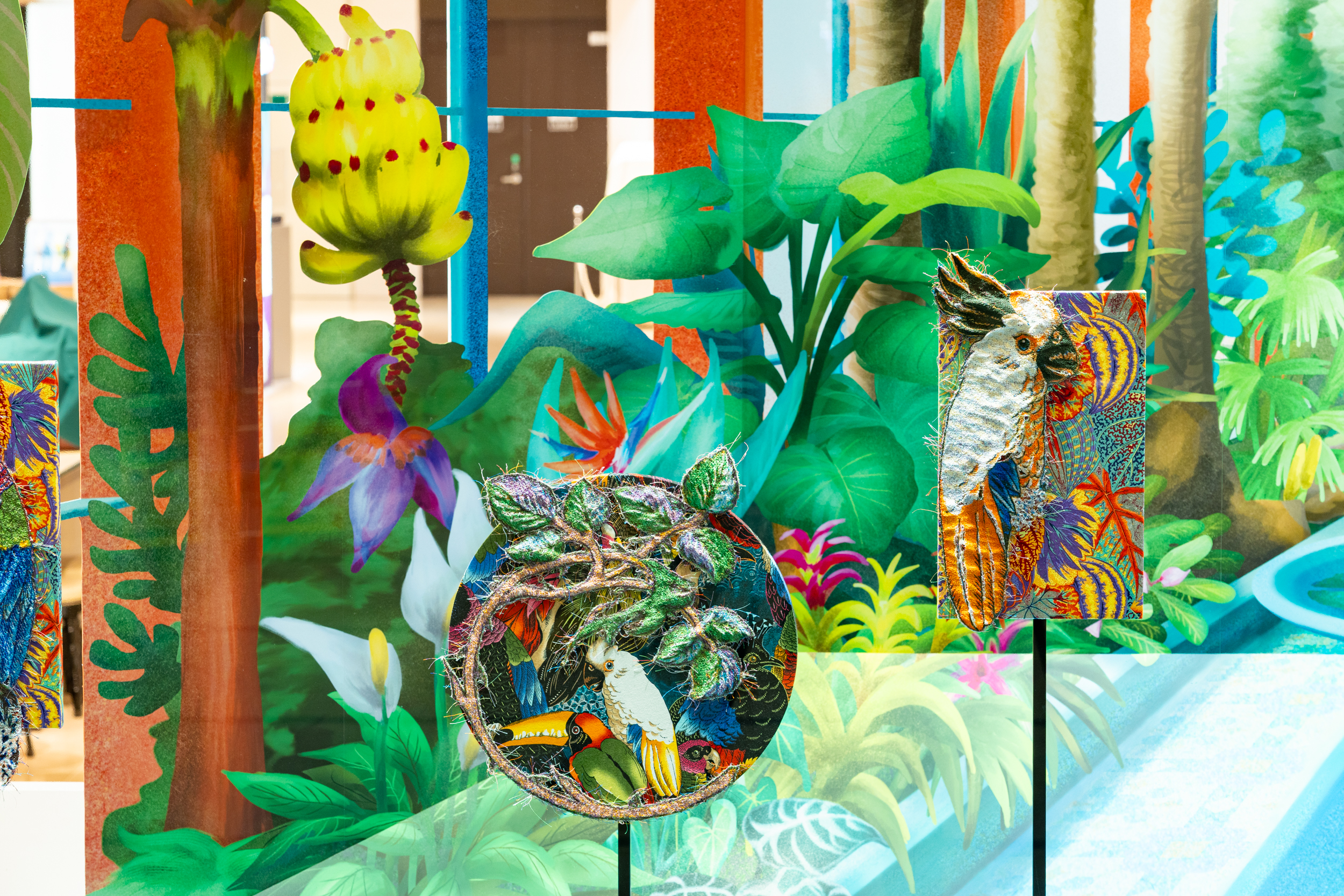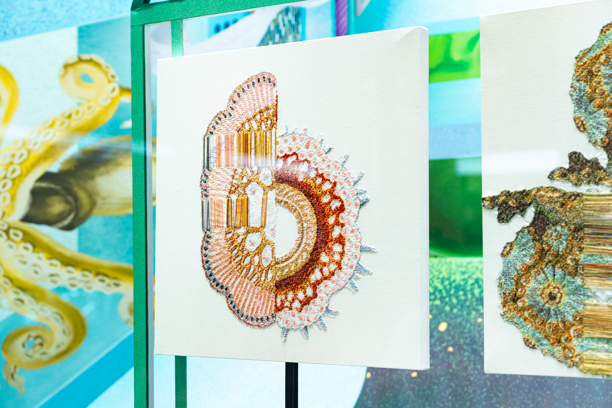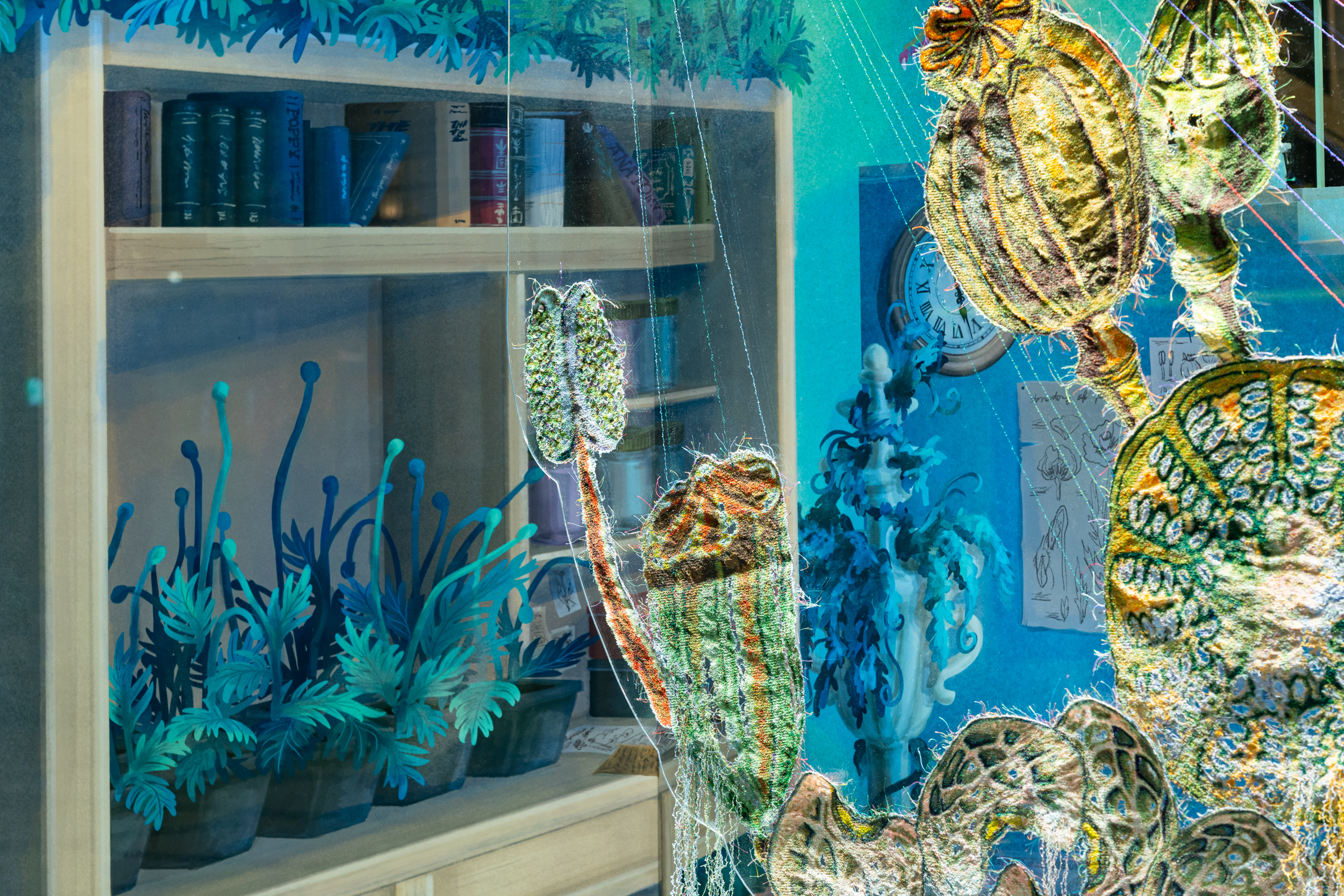 《ニュー博物誌~好奇心の遺伝子~》では、百貨店のウィンドウがさまざまな動植物の息づく空間に変化し、巨大な博物図鑑がコンコースに浮かび上がります。宮田彩加が手がけた刺繍作品には、ドイツの生物学者エルンスト・ヘッケルの生物画や、古今東西の布に描かれた動植物が引用され、ミシンの誤作動を巧みに利用した偶発的な形状が、自然界に潜む、思いもよらない展開の可能性をほのめかしています。