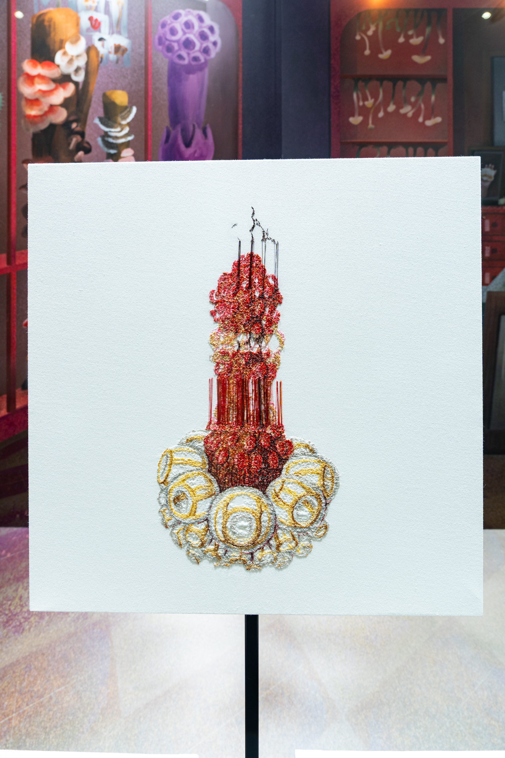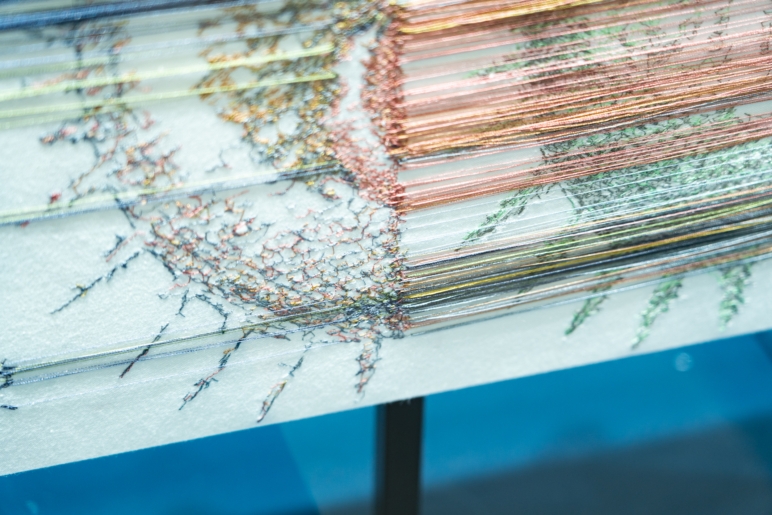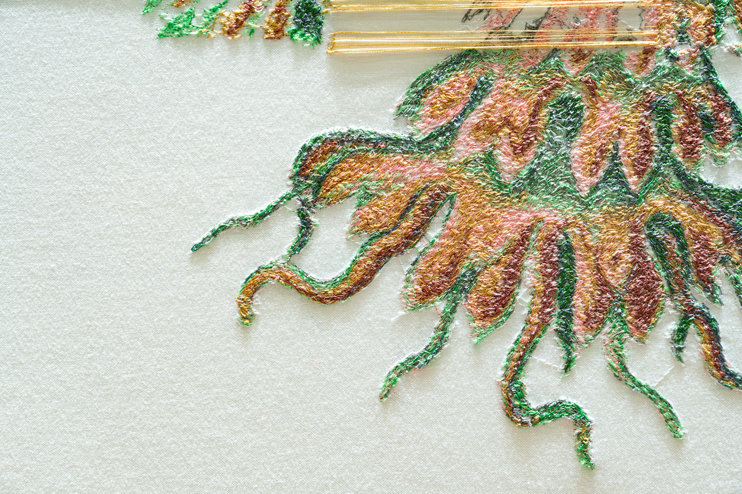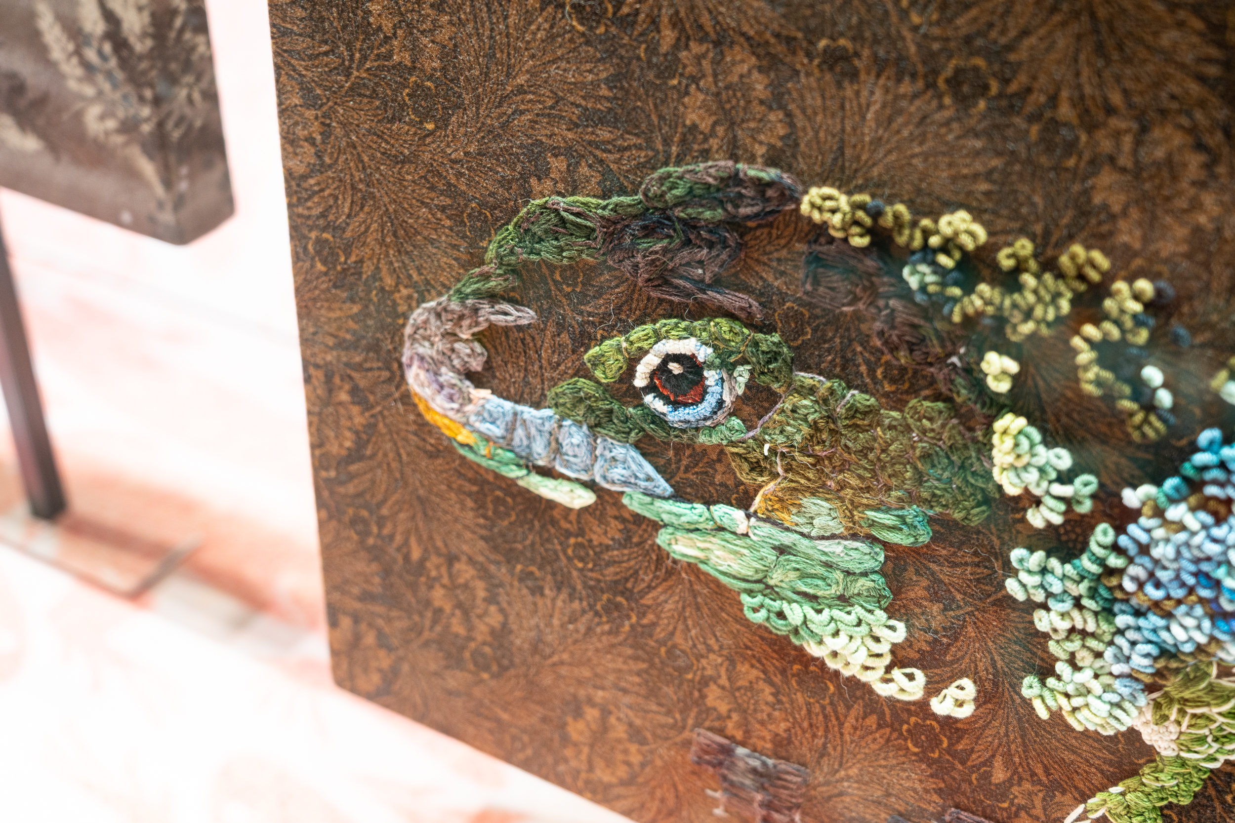 《ニュー博物誌~好奇心の遺伝子~》では、百貨店のウィンドウがさまざまな動植物の息づく空間に変化し、巨大な博物図鑑がコンコースに浮かび上がります。宮田彩加が手がけた刺繍作品には、ドイツの生物学者エルンスト・ヘッケルの生物画や、古今東西の布に描かれた動植物が引用され、ミシンの誤作動を巧みに利用した偶発的な形状が、自然界に潜む、思いもよらない展開の可能性をほのめかしています。