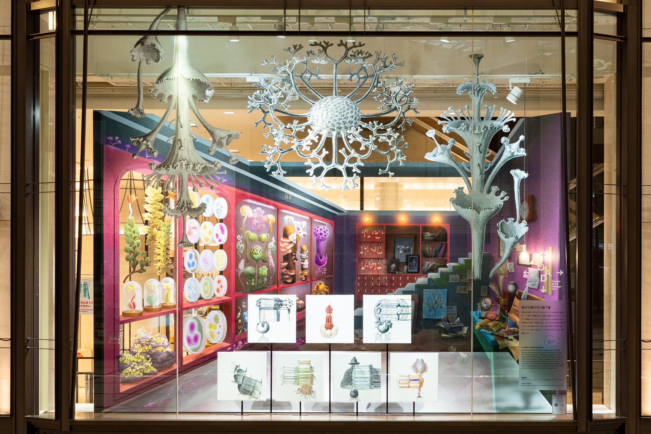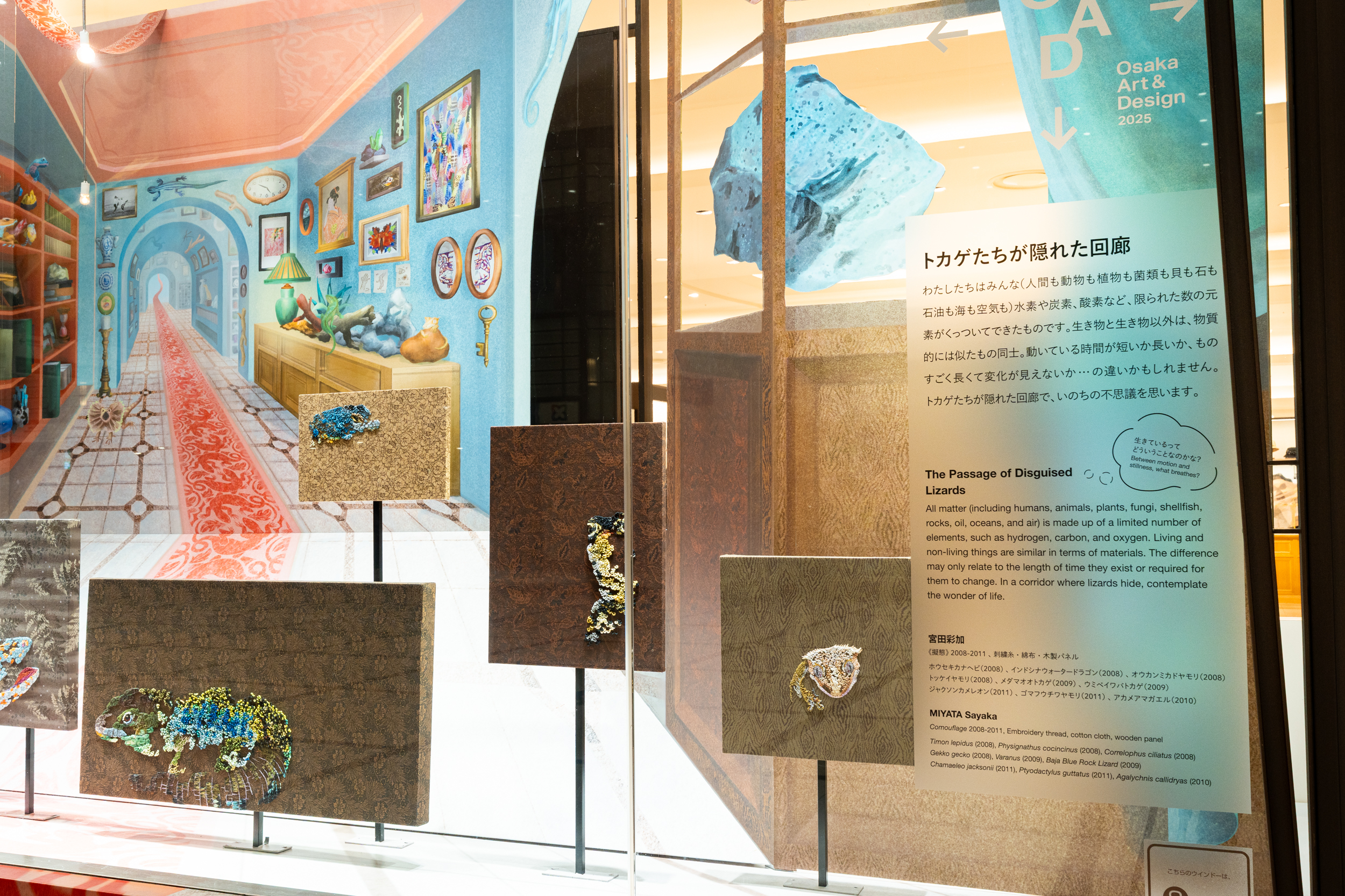 EXPO2025 大阪・関西万博の開催に合わせ、「驚異の部屋」や博物館、博覧会など、“集めて” “見たい” 私たち人間の好奇心の系譜をテーマに、コダマシーンが大規模なインスタレーションを企画・ディレクションしました。また、開催時期は大阪の街を巡りながらアートやデザインに出会う周遊型エリアイベント『Osaka Art & Design 2025(以下、OAD2025)』のプログラムにもなりました。刺繍を用いるアーティスト・宮田彩加の作品に現れる動植物を起点にグラフィックデザイナー・看板屋 廣田碧がデザインとイラストレーションで協力。巨大な博物図鑑や騙し絵の手法を使ったコレクションルームのセットを大阪梅田に出現させました。