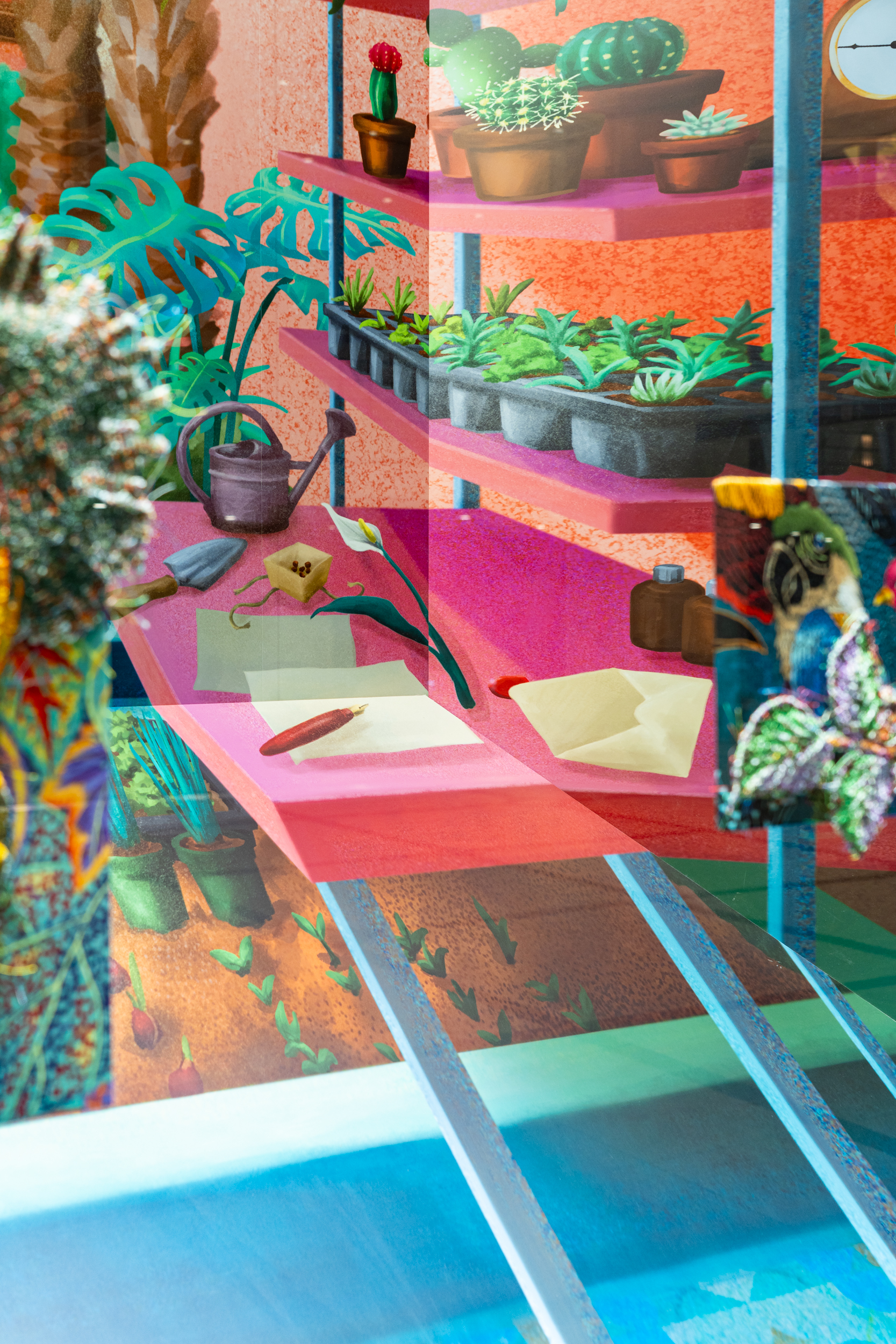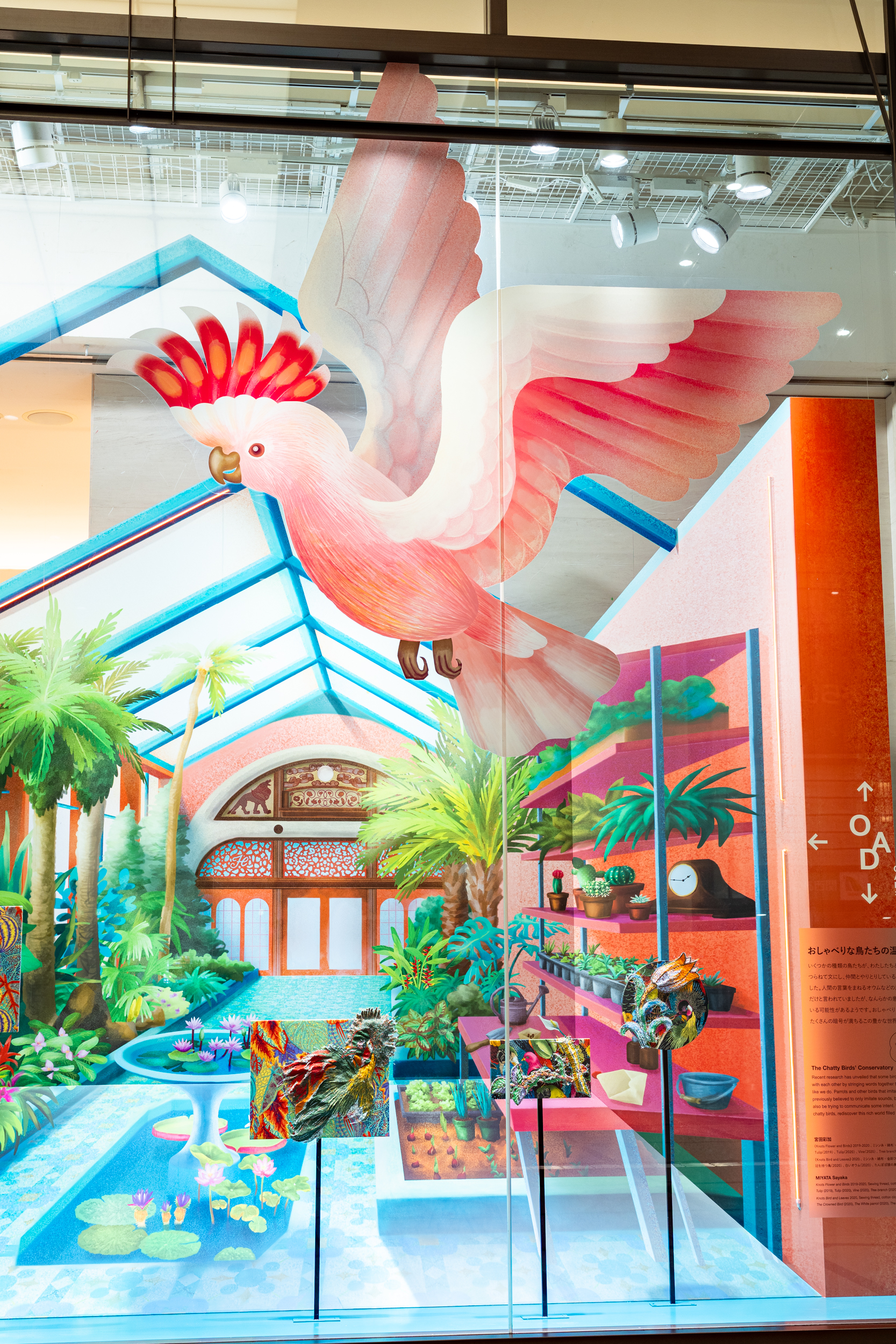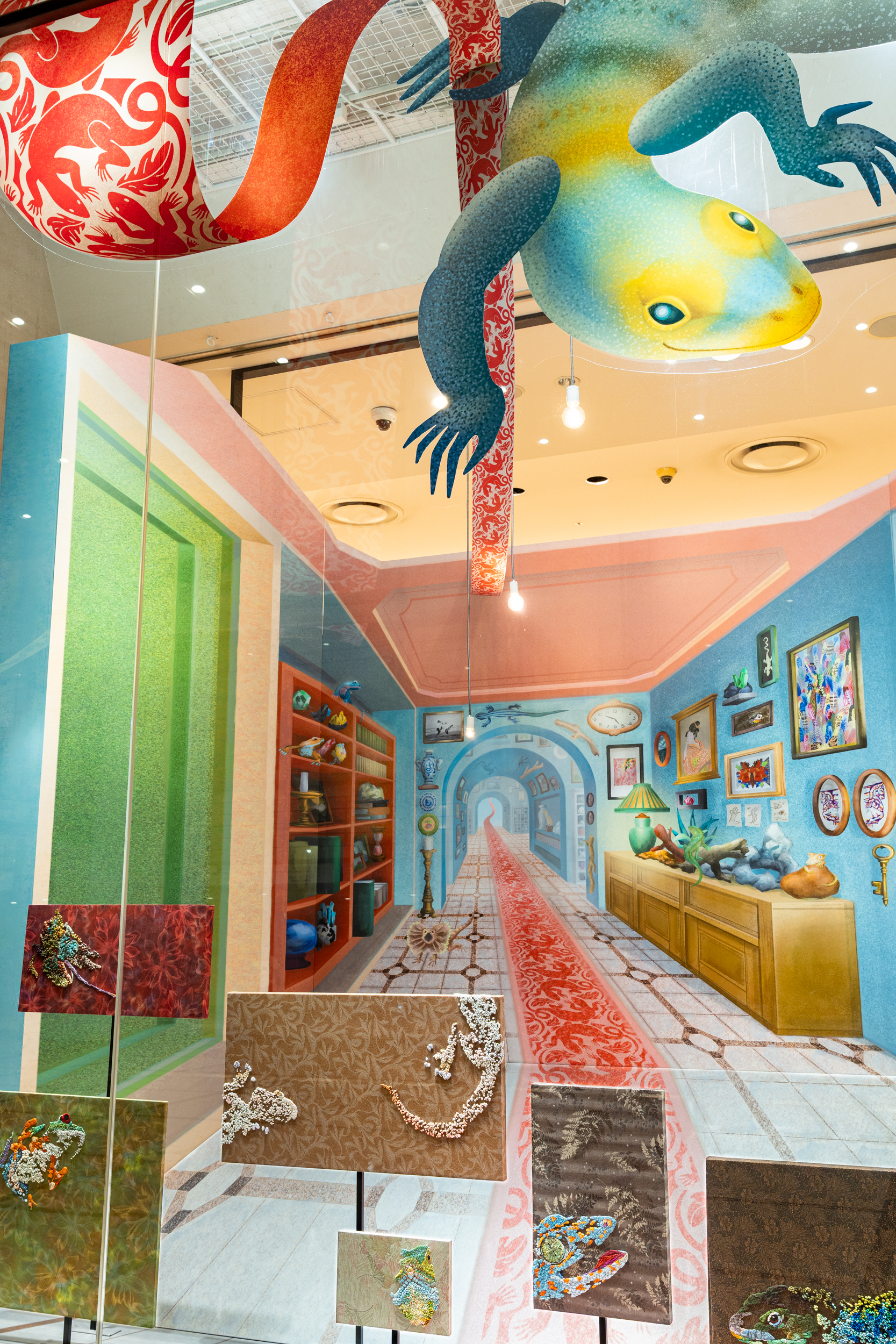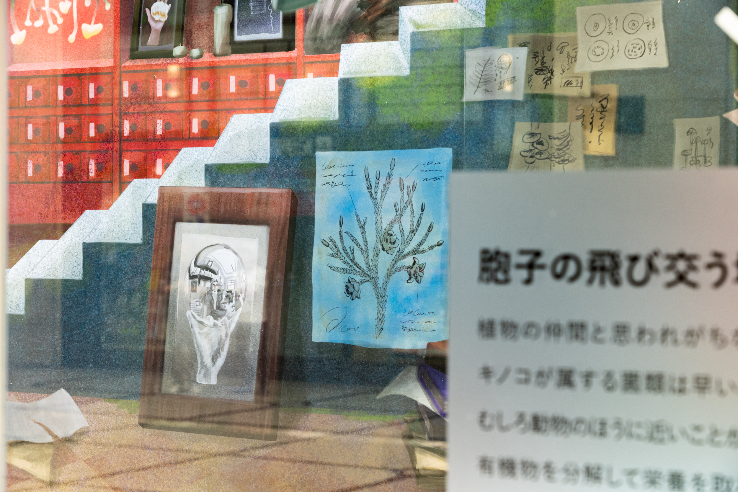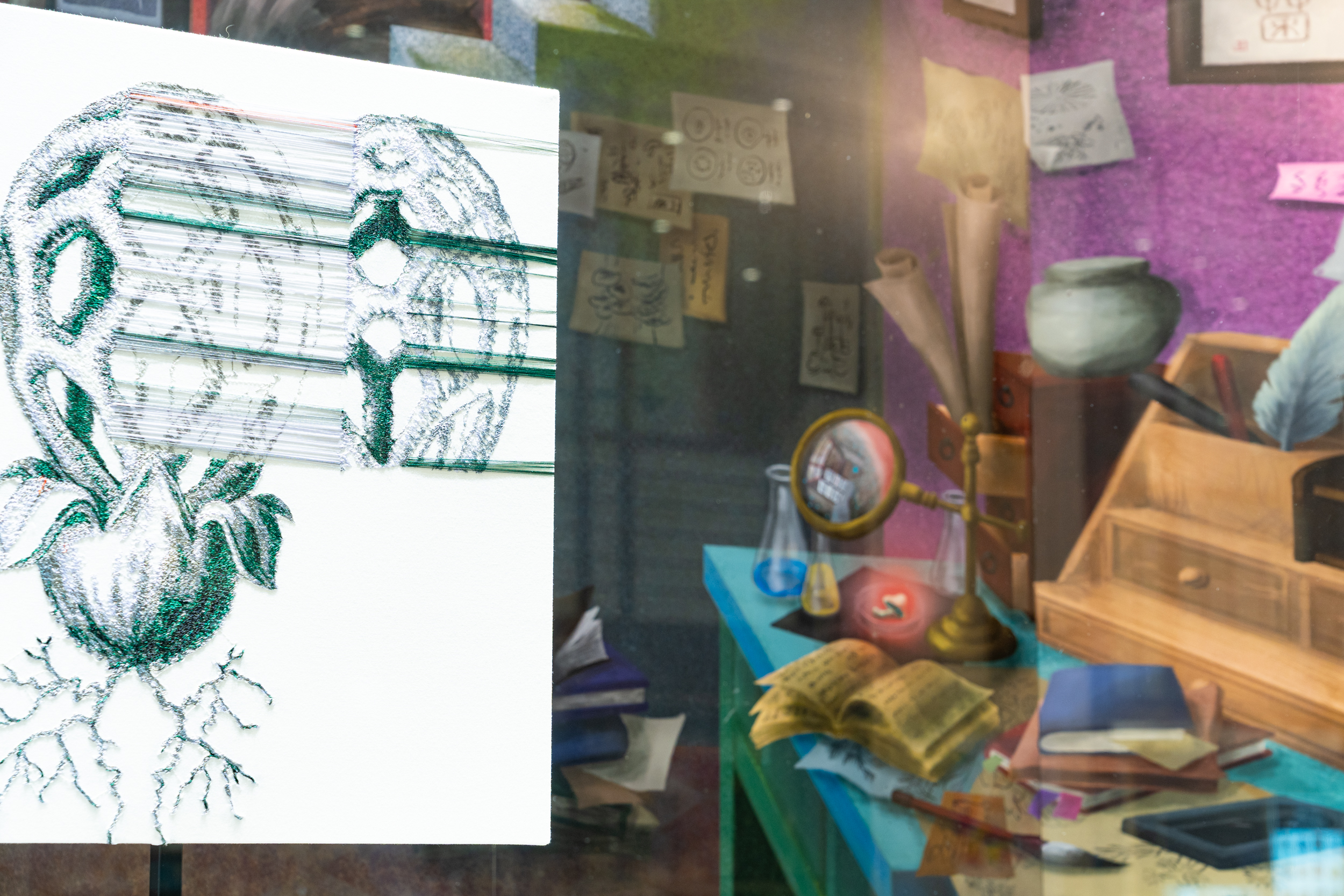 廣田碧は、宮田作品をはじめとする多様な品々を一つの世界観のもとに統合します。ウィンドウ内部に用いられたのは、深い奥行きの錯視効果をもつセットです。廣田は、この効果を通して絵の中と現実世界を架橋し、目の前にある空間を超えた世界を、観る者に想像させます。