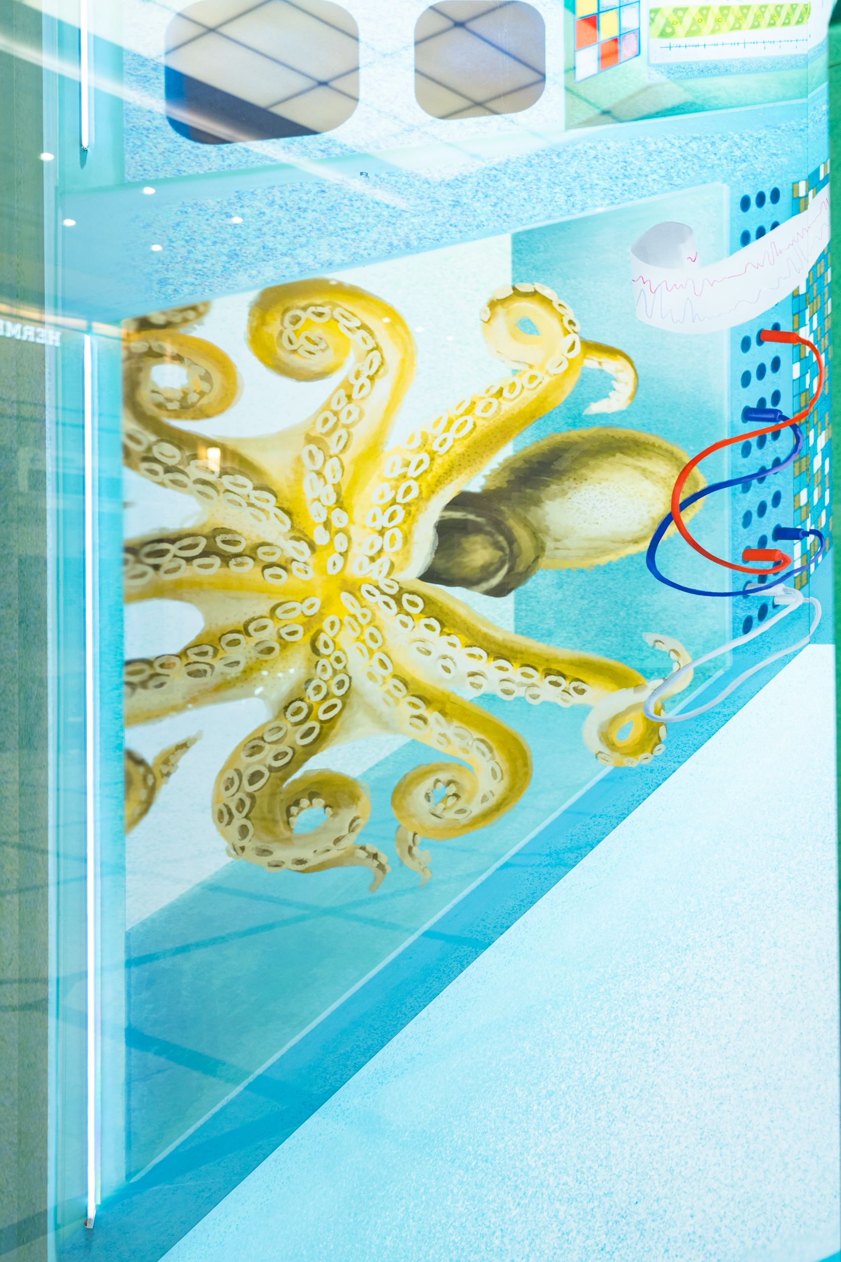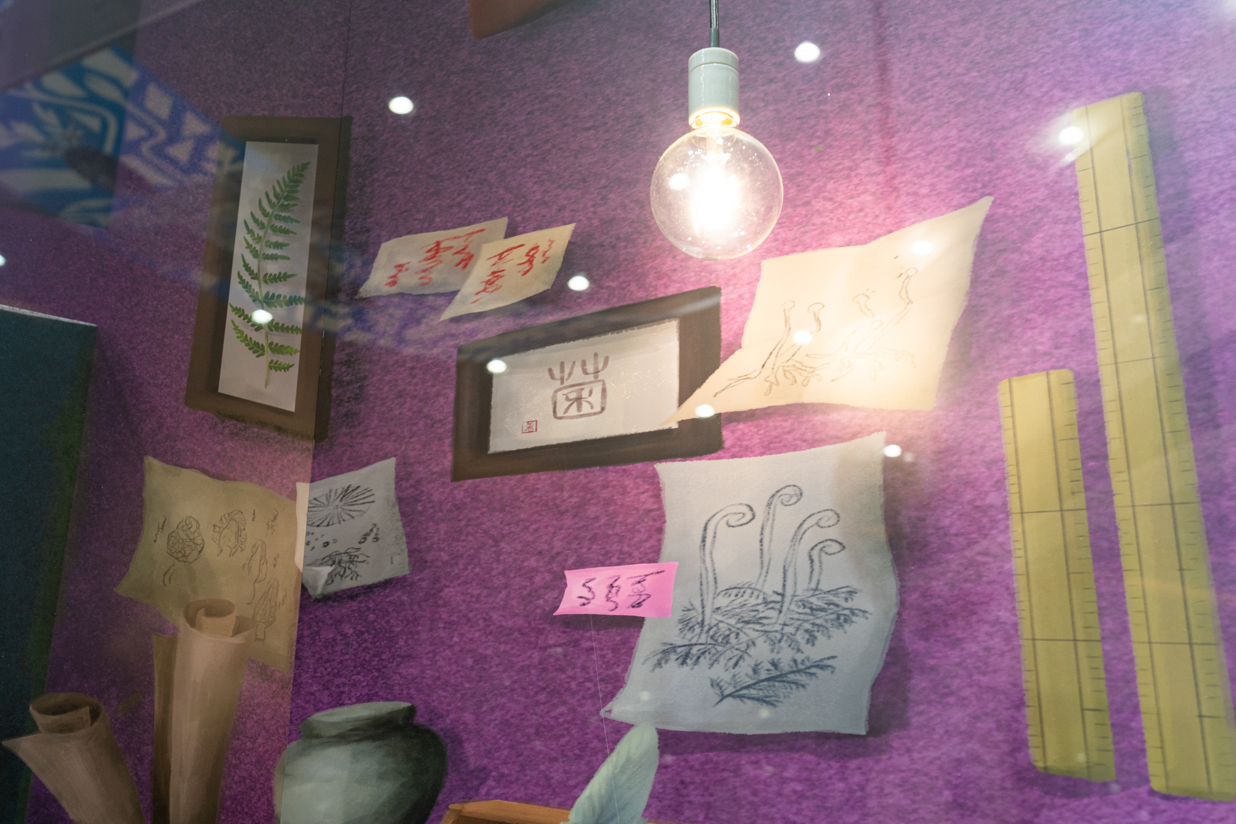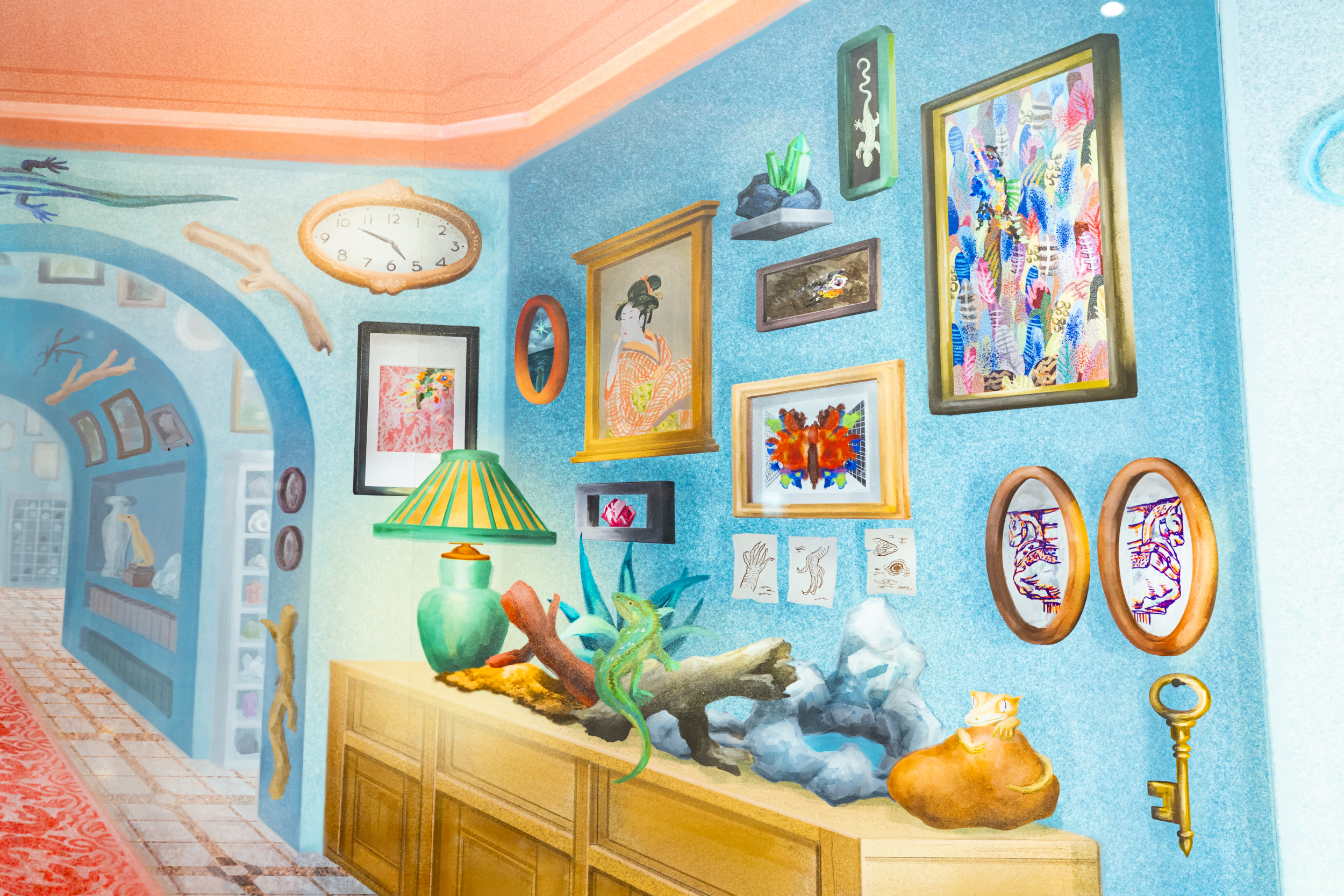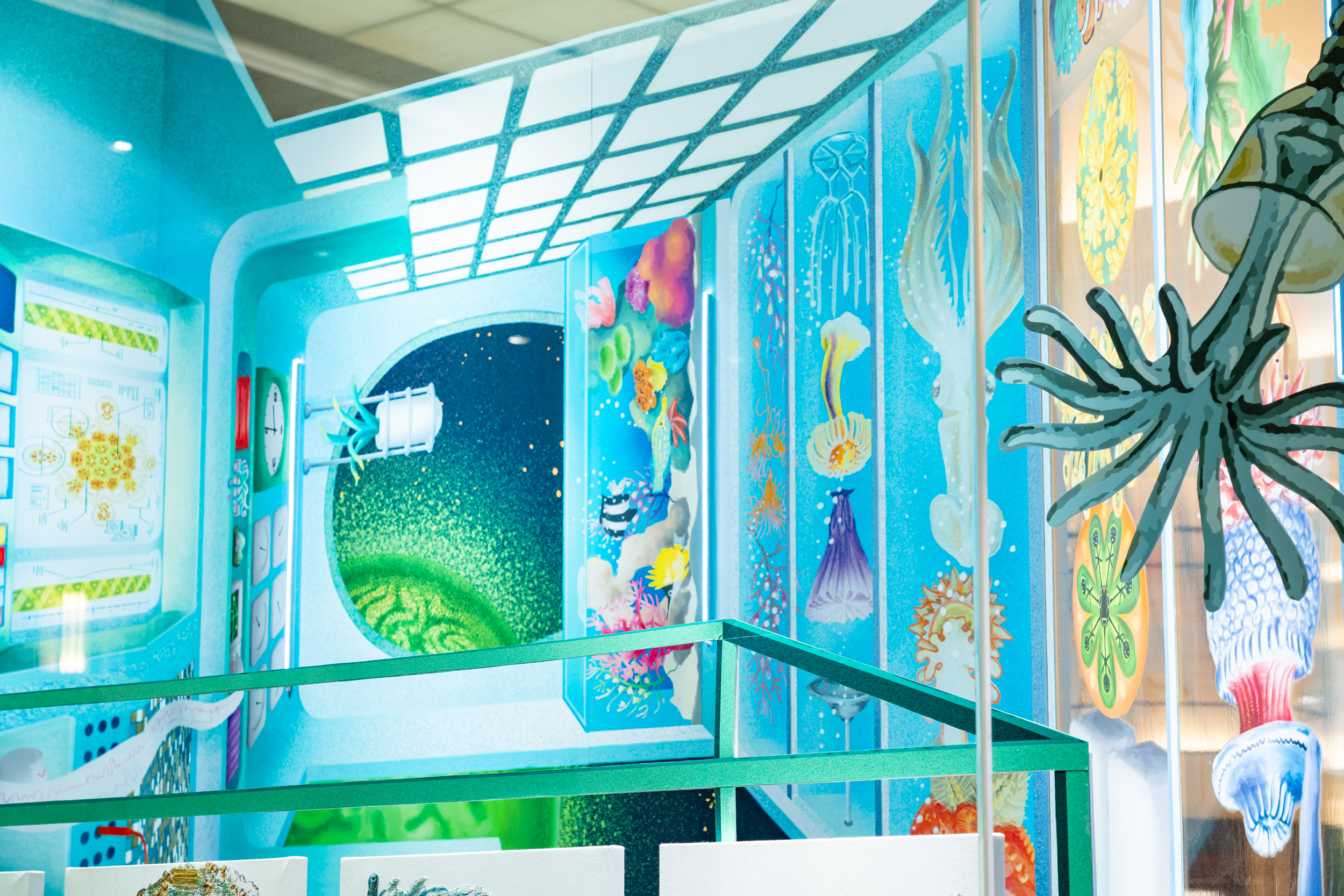 コダマシーンがコンセプトとディレクションを担当した《ニュー博物誌~好奇心の遺伝子~》は、現代美術家・宮田彩加の作品を起点に、看板屋/デザイナーの廣田碧が空間デザインと描画を行い、「未知」への知的好奇心が駆動する私たちの世界を表現したインスタレーションです。