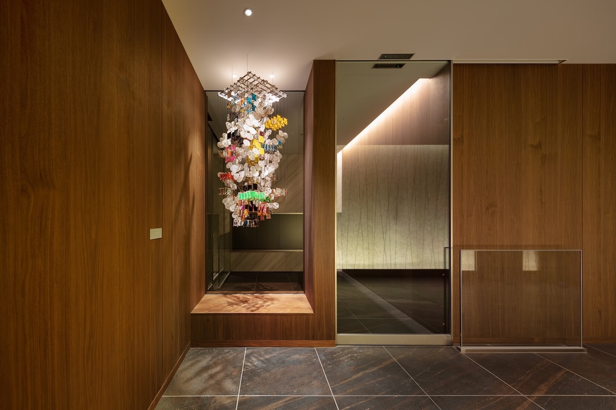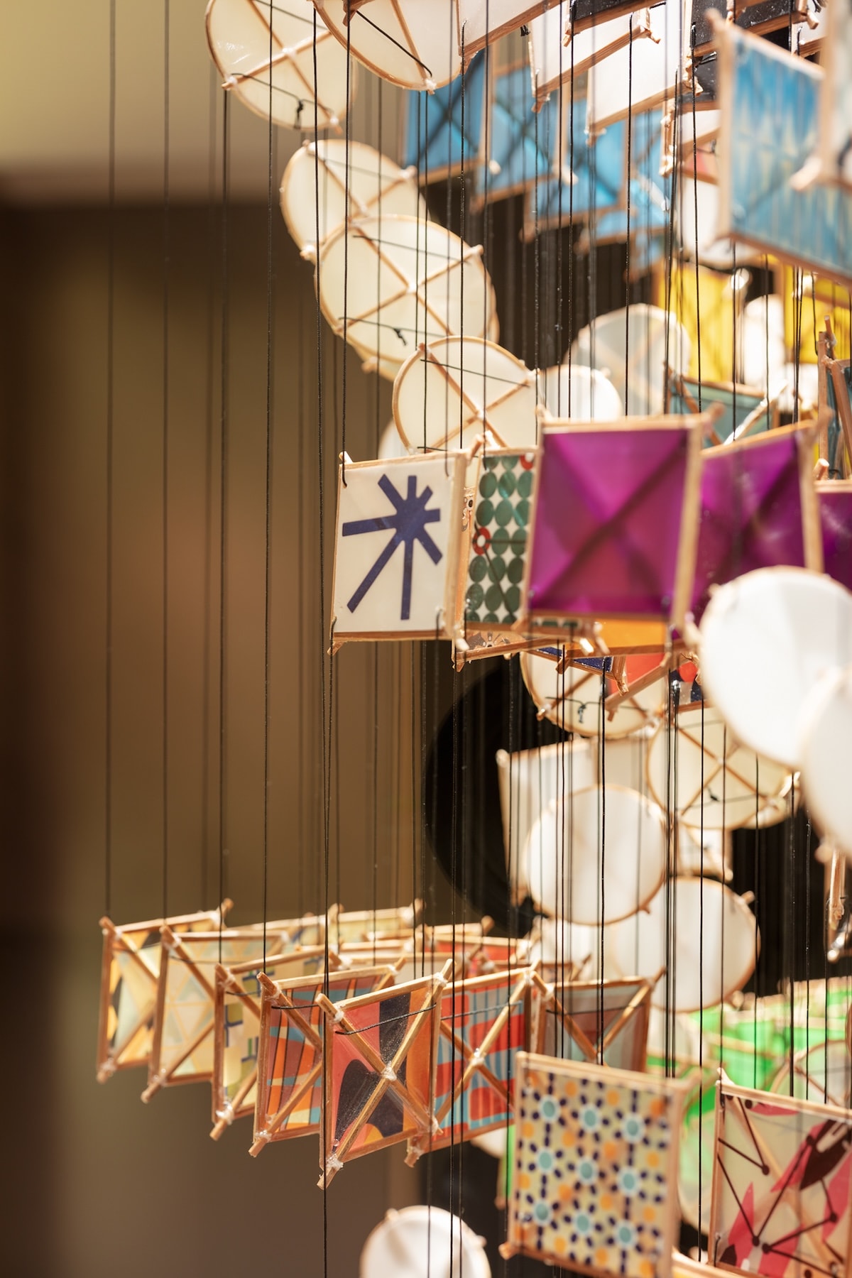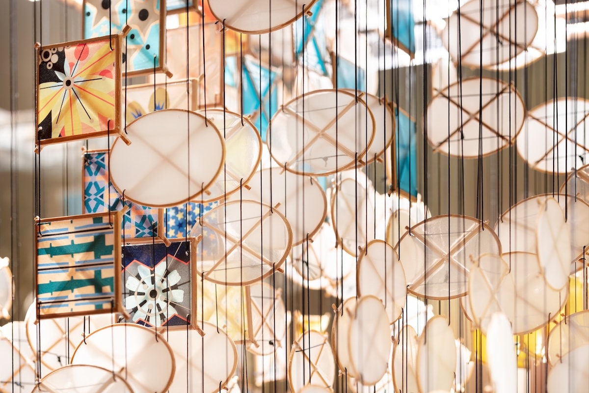 紙を張った凧のような小さなユニットを多数組み合わせ、雲と風景が混ざり合ったような空間的作品を作るジェイコブ・ハシモト。ふだんは何メートルもある巨大な作品を手がけていますが、今回は常盤橋タワーのVIP動線に小さな作品を作ってくれました。