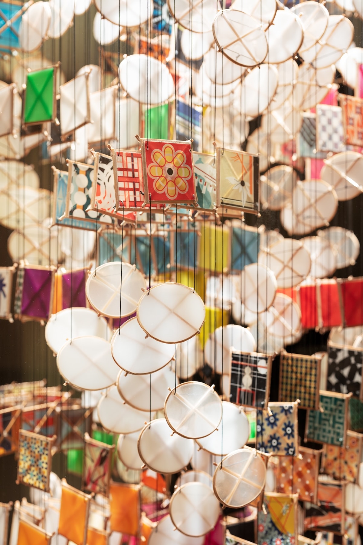 半透明の素材が、空間の内外を柔らかく仕切る障子のように、人と自然の間にある呼吸を感じさせます。白いユニットは雲や蒸気や光、柄のあるユニットは建物や町の風景、あるいはいろいろな模様の服を着ている人々を連想させるかもしれません。アメリカ人の彼にとって今回が日本で初めての展示となります。
