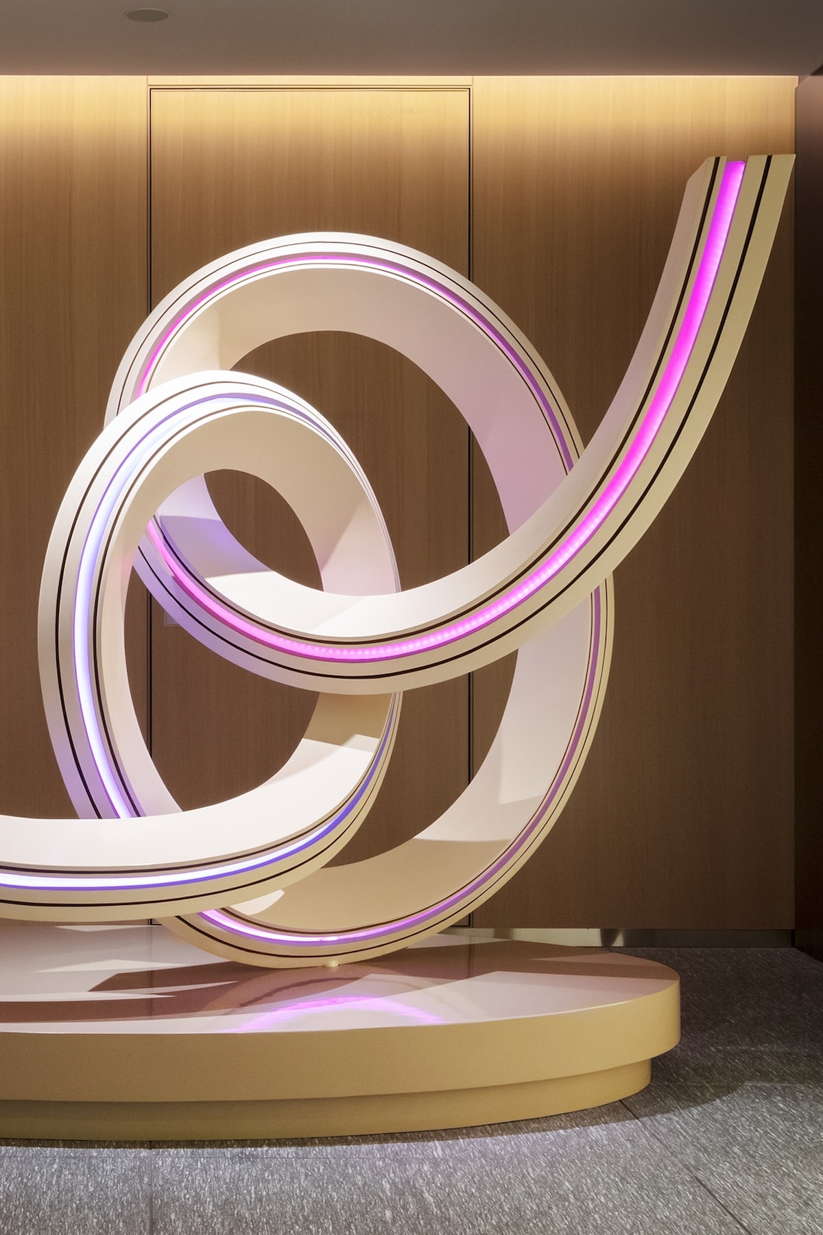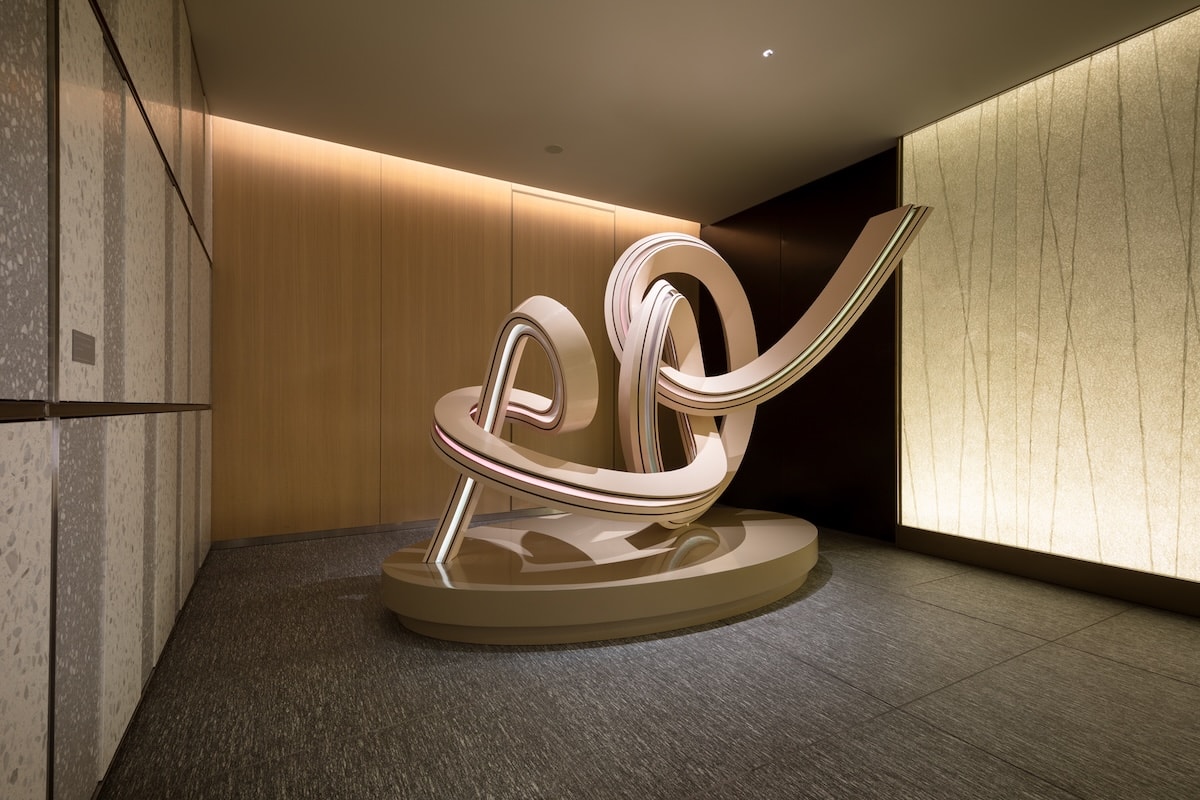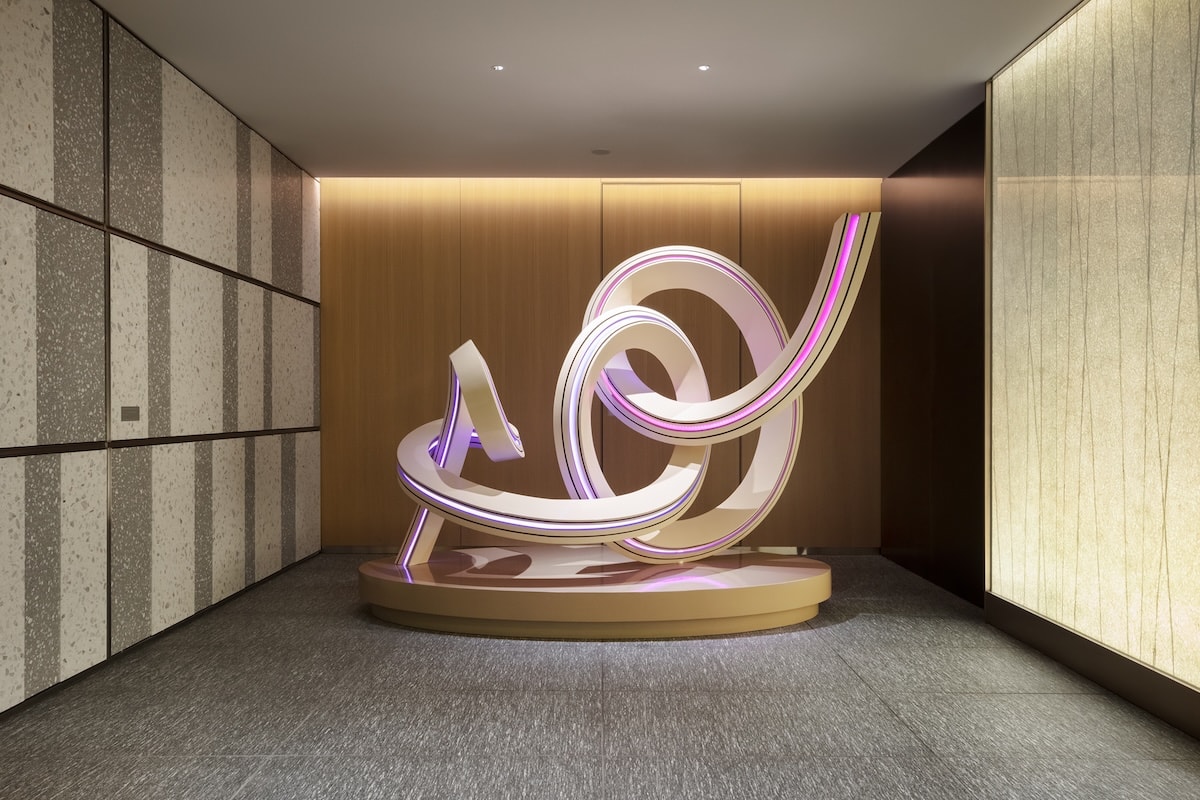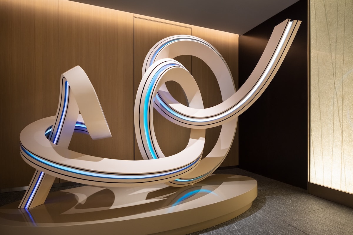 今回の作品では同時に、「縁」を象徴する水引の形を連想させるでしょう。中国との交易をきっかけに日本で発達したとされるこの“結び”の文化が、変化するLEDライトに照らされて、現代、そして未来の印象へと合わさっていきます。東アジアの自然環境、文化の伝統と、これからの時代をつないでいく作品です。