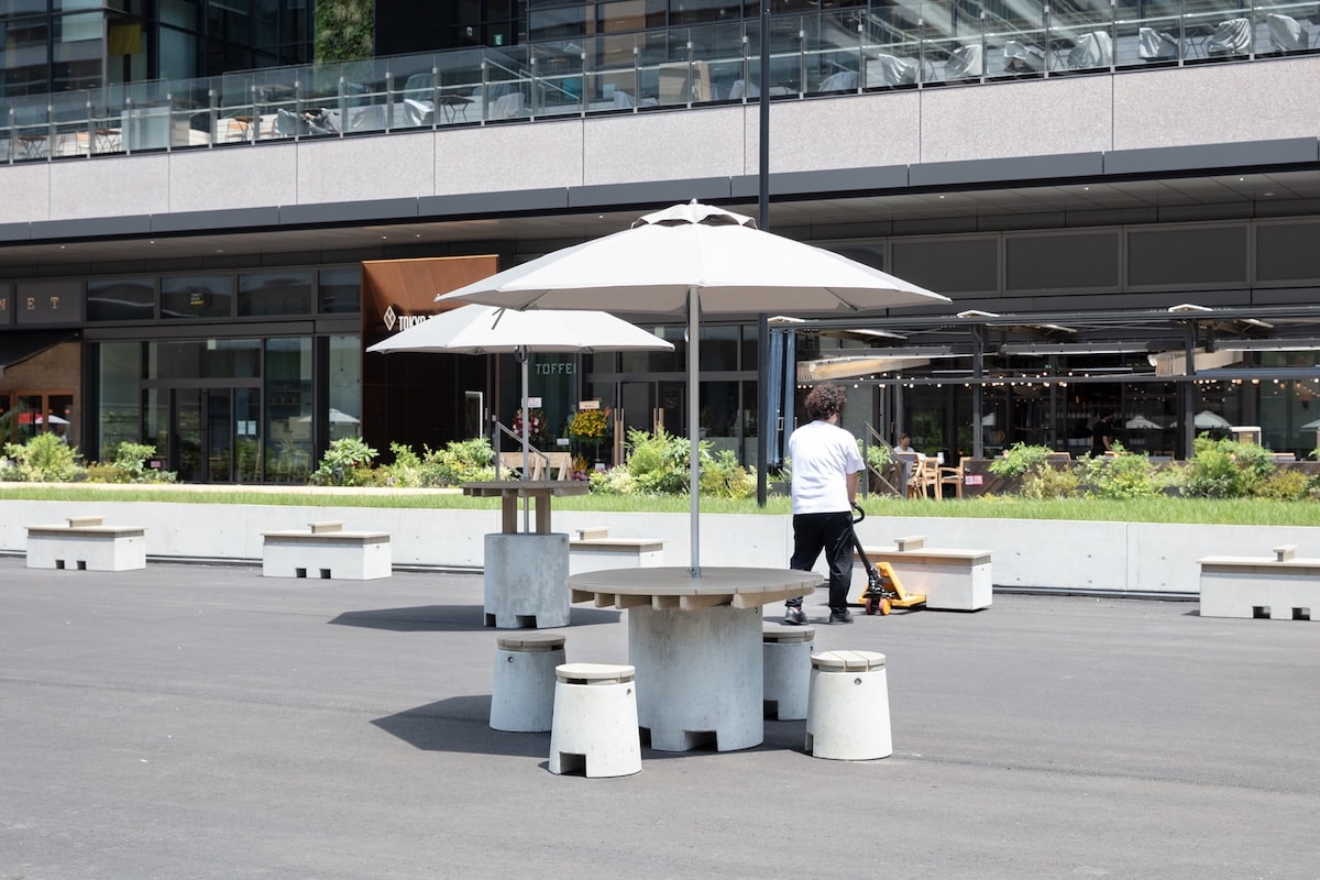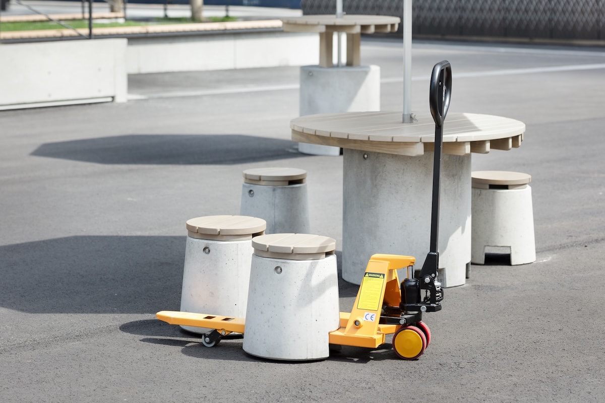 スキーマ建築計画は、人のアクティビティを誘発する道具のシリーズを「インターフェース」と名付けています。今回はこのインターフェースシステムから、ハンドリフターを持つ管理者だけが動かせるベンチやテーブルを、広場のファーニチャーに採用しました。いくつかの形に組み直せるので、キッチンカーが並ぶお昼どき、イベント時、マーケットを開催するとき……など、状況に応じた使い方ができます。フォーメーションを柔軟に変えることで、人の動きや活気を生み出していきます。