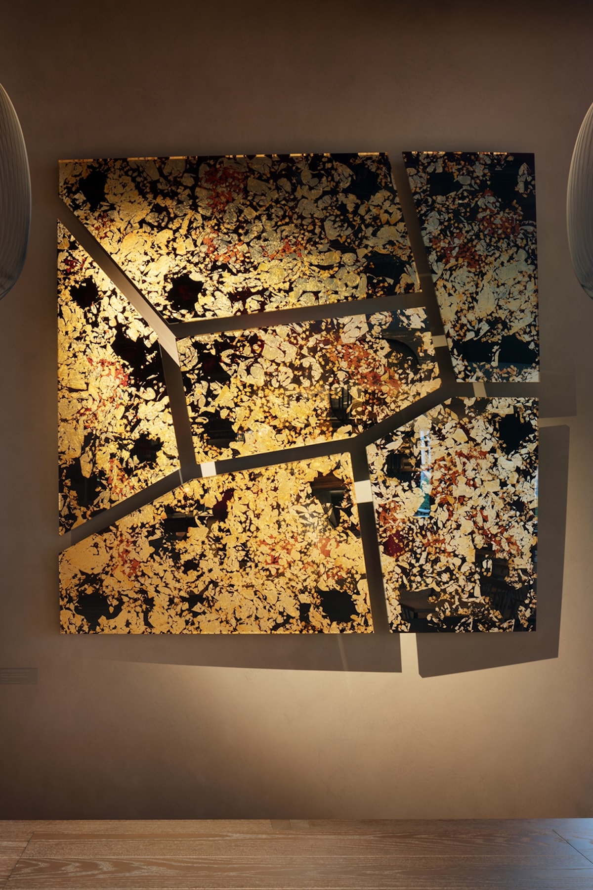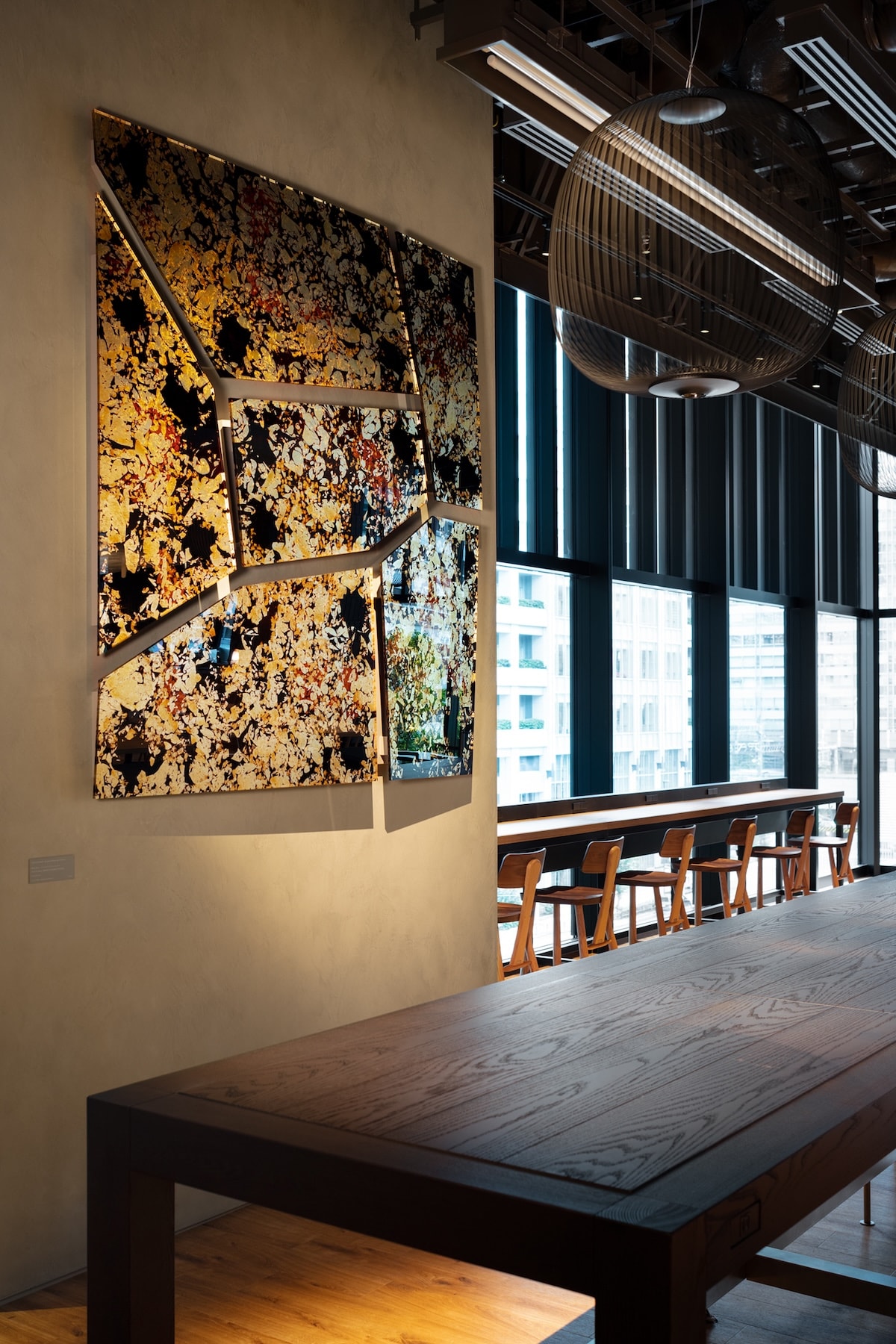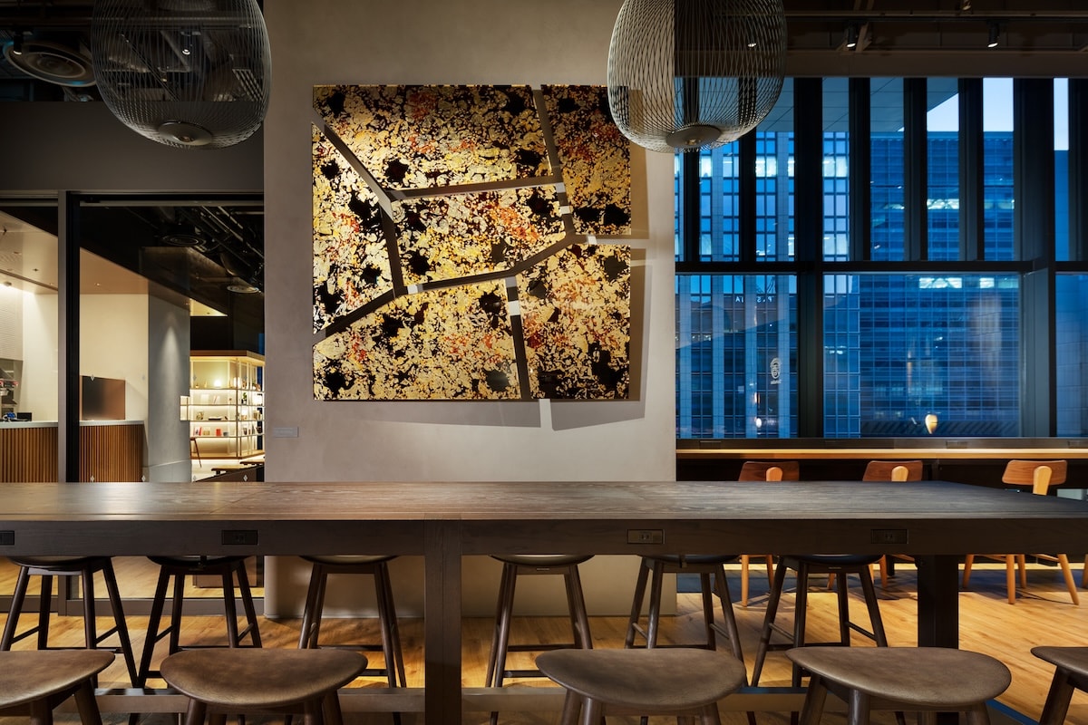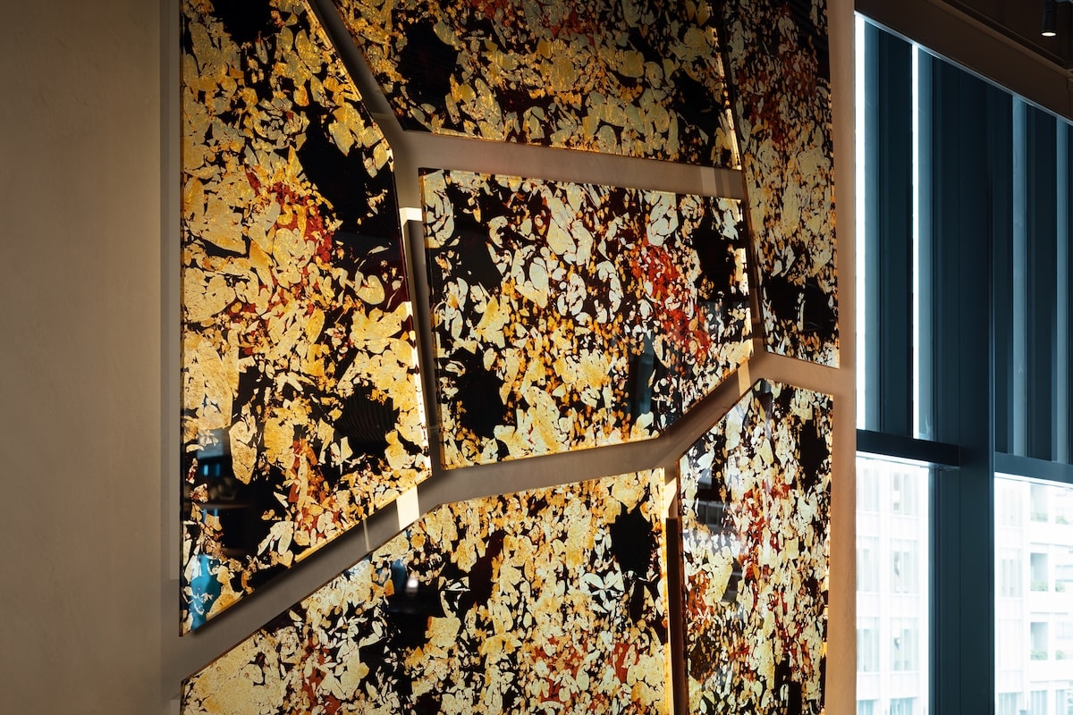 プロダクトデザイナーの鈴木啓太が今回手掛けるのは、漆技能士とコラボレーションした、漆と銀箔の壁掛け作品です。モチーフとなっているのは常盤橋建設と同時期に建設された江戸城の石垣。江戸城の石垣には実に多くの刻印があり、石垣全体が多くの異なる人々により作られたことがわかるそうです。鈴木は、この異なる複数の力によって実現するものとして石垣をとらえました。また石垣に苔が生えるように、漆と共に銀箔の模様も、時間をかけて変化していきます。先人の努力と伝統技術、そして変化することを恐れない気持ちが、この作品に表れています。