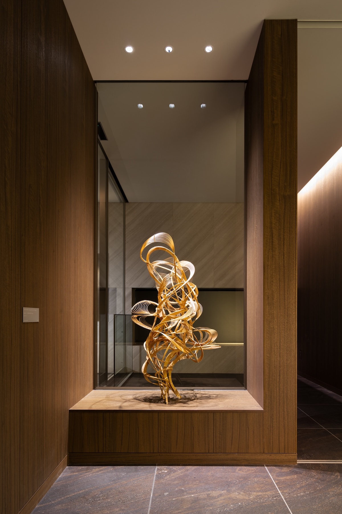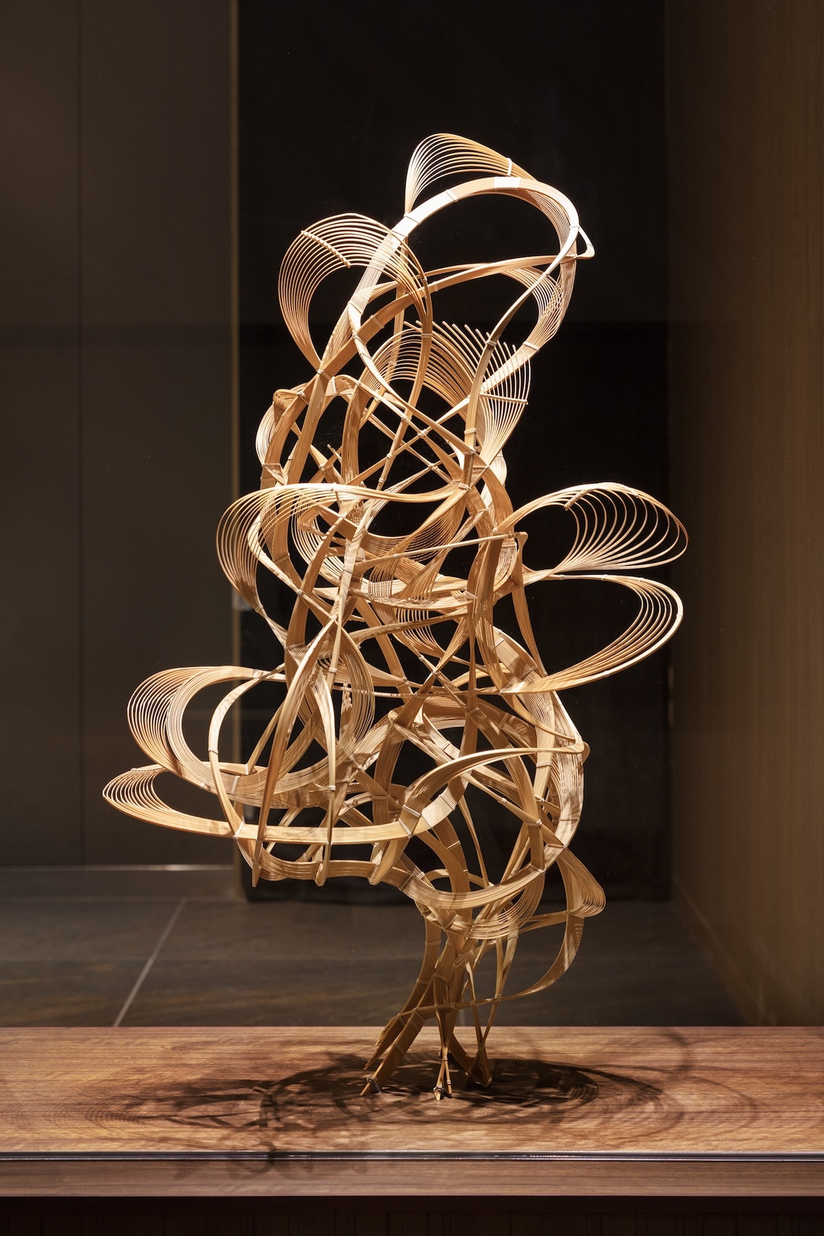 くるくると旋回する飛行体が描く軌跡のような、どこか異星にたたずむ建造物のような、斬新な造形が魅力的な横山修の作品。竹ひごが作り出すラインの一つひとつを目で追っていくと、信じられないほど自由な気持ちになります。